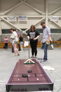 Joshalynn Dooley plays shuffleboard as volunteer Joseph Spears looks on during the Turning Point’s 2023 After Prom Party event for freshmen and sophomores held at Central Middle School in Columbus, Ind., Saturday, May 6, 2023.