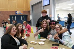 Carla Clark | For The Republic Abigail Emery, clockwise from left, Kaydence Evans, Luke McCleary, Charlie Stamps, Damon Starks, and Makayla Long during the Turning Point's 2023 After Prom Party event for freshmen and sophomores held at Central Middle School in Columbus, Ind., Saturday, May 6, 2023.