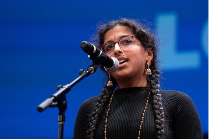 Watch Munjuluri recite “The New Colossus” by Emma Lazarus at the 2023 Poetry Out Loud National Finals.
