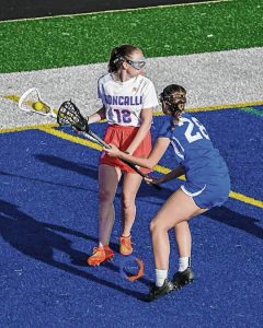 Columbus North’s Kate Ellis, right, defends a Roncalli player during a girls lacrosse game this season.