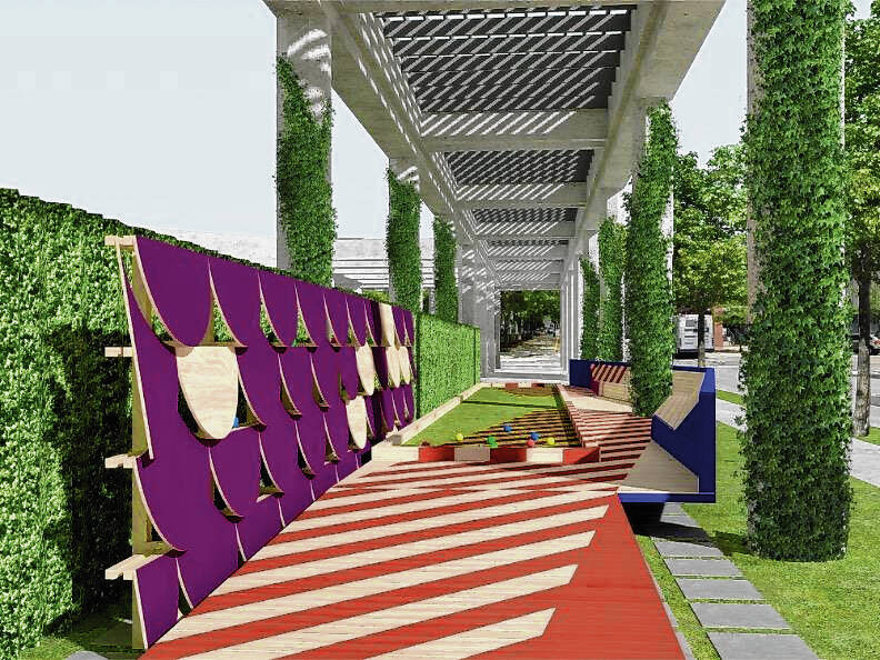 Photo provided by Exhibit Columbus “Ground Rules” has an elevated playing court and seating under a concrete colonnade at the Cummins Corporate Office Building in downtown Columbus, presented by Jessica Colangelo and Charles Sharpless.