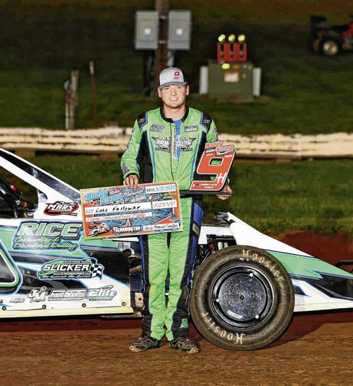 Cole Falloway captured the Roddy Strong Memorial on May 12 at Bloomington Speedway. There was a huge 42-car field for the open wheel modifieds from nine different states battling it out for the $9,999.99 top prize to honor the late Roddy Harris and his father, Rod Harris, Sr.
