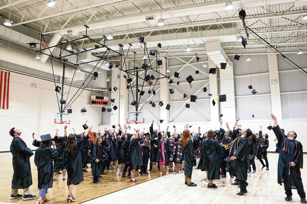 Carla Clark | For The Republic The graduating class of 2023 cap toss in the auxiliary gym during the Columbus Signature Academy New Tech High School graduation held at Columbus East High School in Columbus, Ind., Friday, May 26, 2023.
