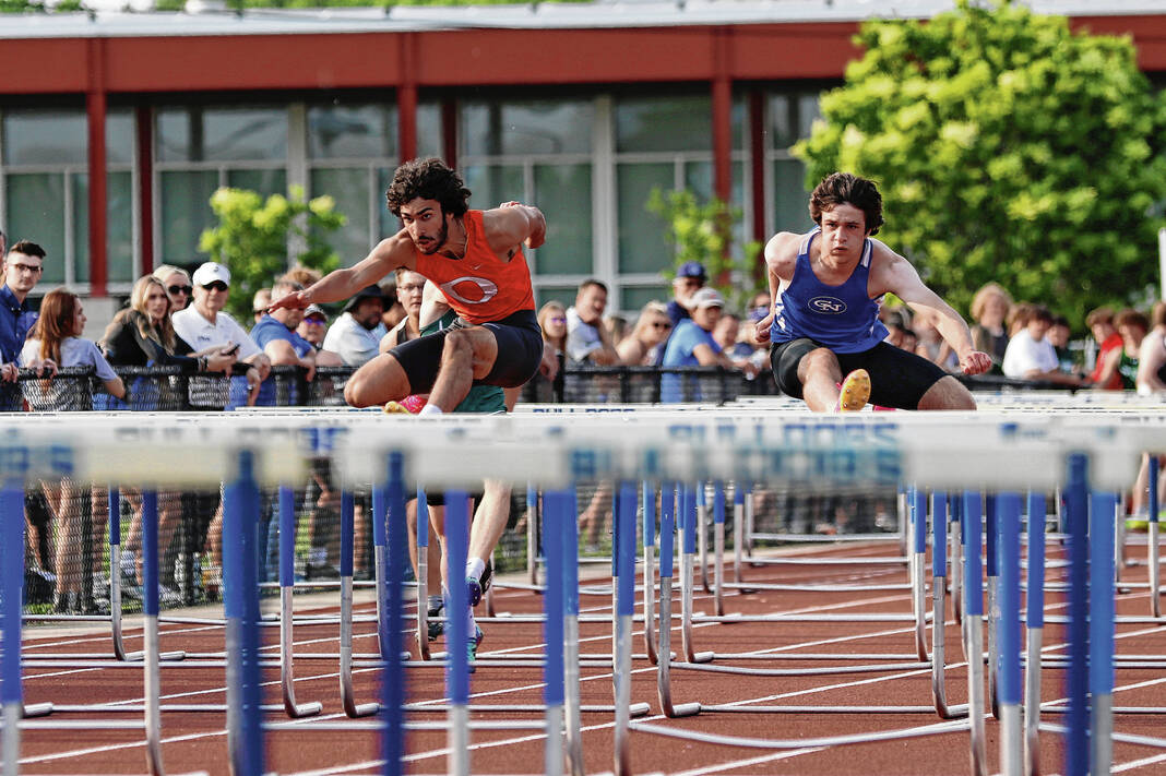 Columbus East’s Henrique Carvalho, left, and Columbus North’s Owen Russell run the 110-meter hurdles prelims during the sectional at Columbus North, Thursday, May 18, 2023.