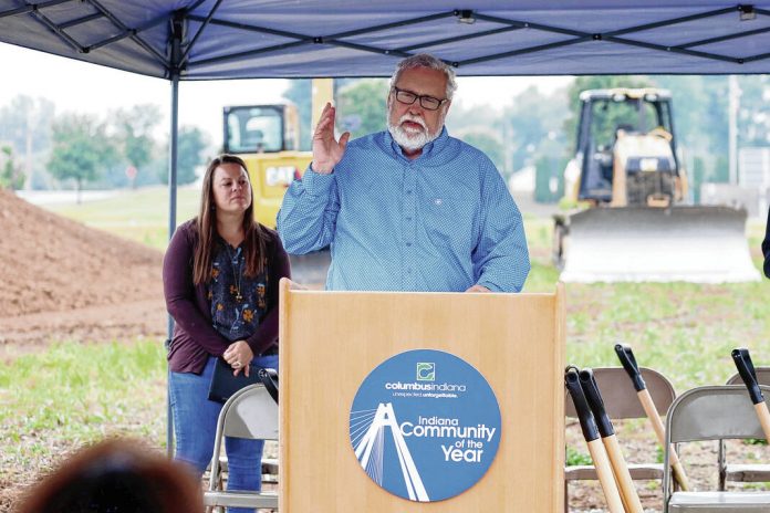 Carla Clark | For The Republic Mayor Jim Lienhoop speaks during the Columbus City Utilites groundbreaking ceremony for the new water tank at the former Walesboro airport in Columbus, Ind., Wednesday, June 7, 2023.