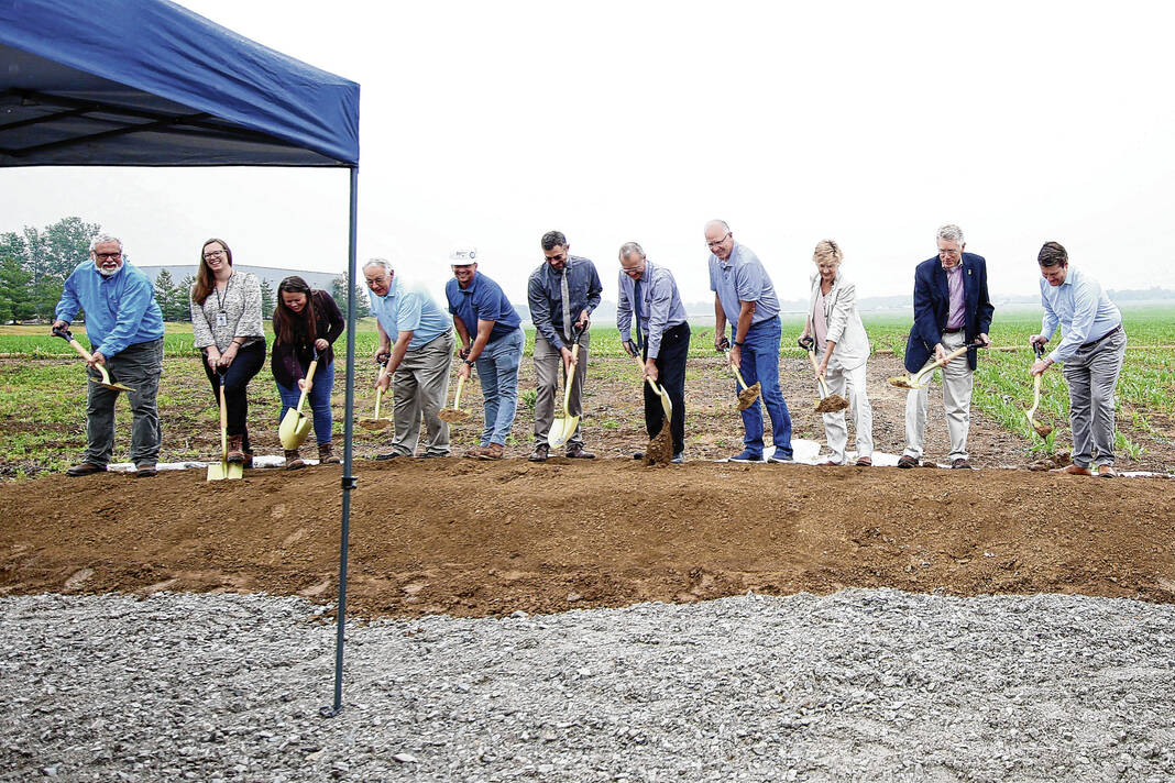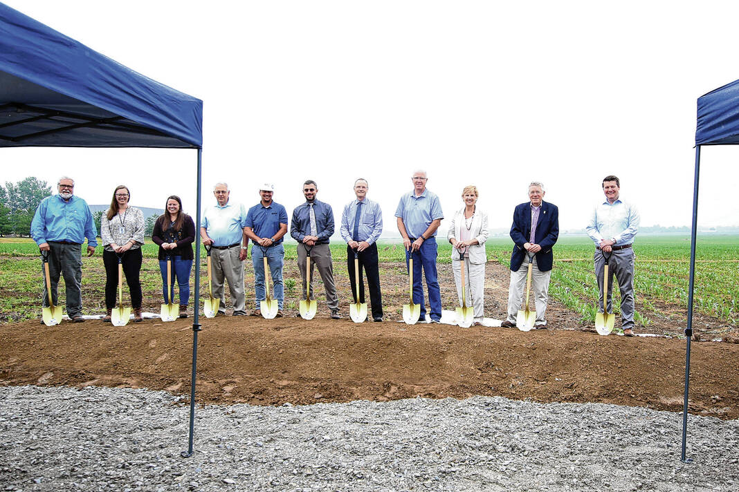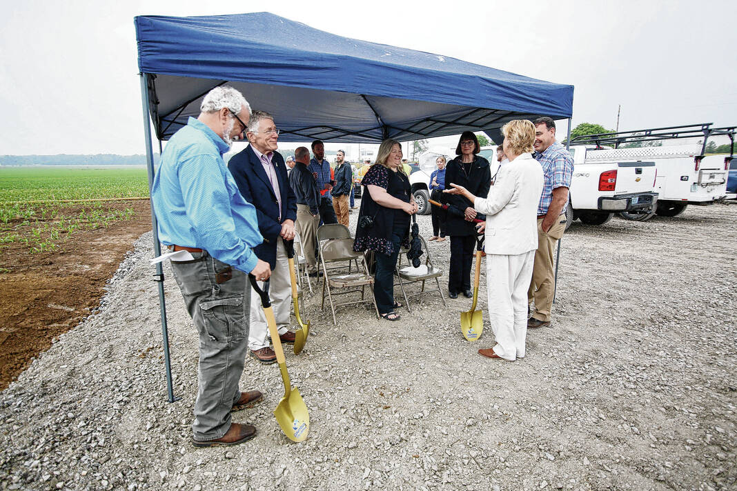 Carla Clark | For The Republic Roger Kelso, Brandi Rodriguez, Ashley Getz, Stan Gamso, Mark Cvetkovich, Ryan Mackos, Jim McNulty, Tim Shuffett, Mary Ferdon, Mayor Jim Lienhoop, and Patrick Andrews during the Columbus City Utilites groundbreaking ceremony for the new water tank at the former Walesboro airport in Columbus, Ind., Wednesday, June 7, 2023.