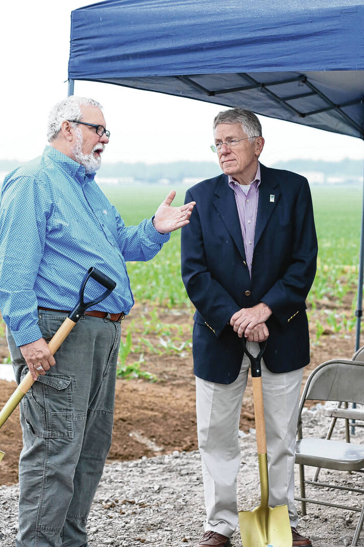 Carla Clark | For The Republic Roger Kelso, CCU executive director, and Mayor Jim Lienhoop during the Columbus City Utilites groundbreaking ceremony for the new water tank at the former Walesboro airport in Columbus, Ind., Wednesday, June 7, 2023.