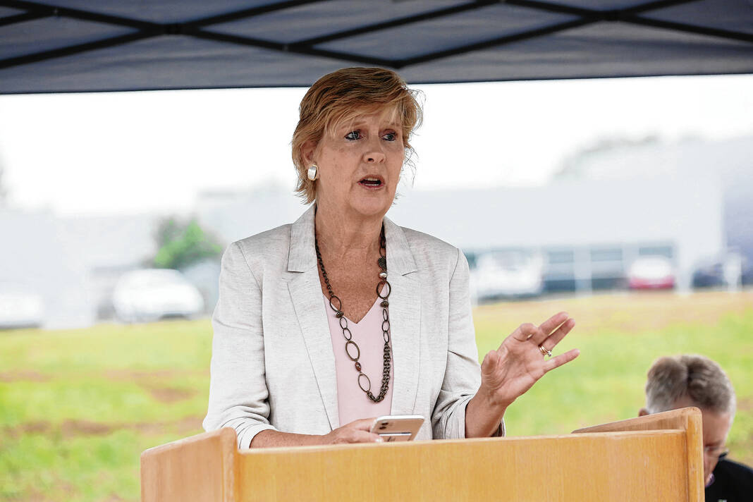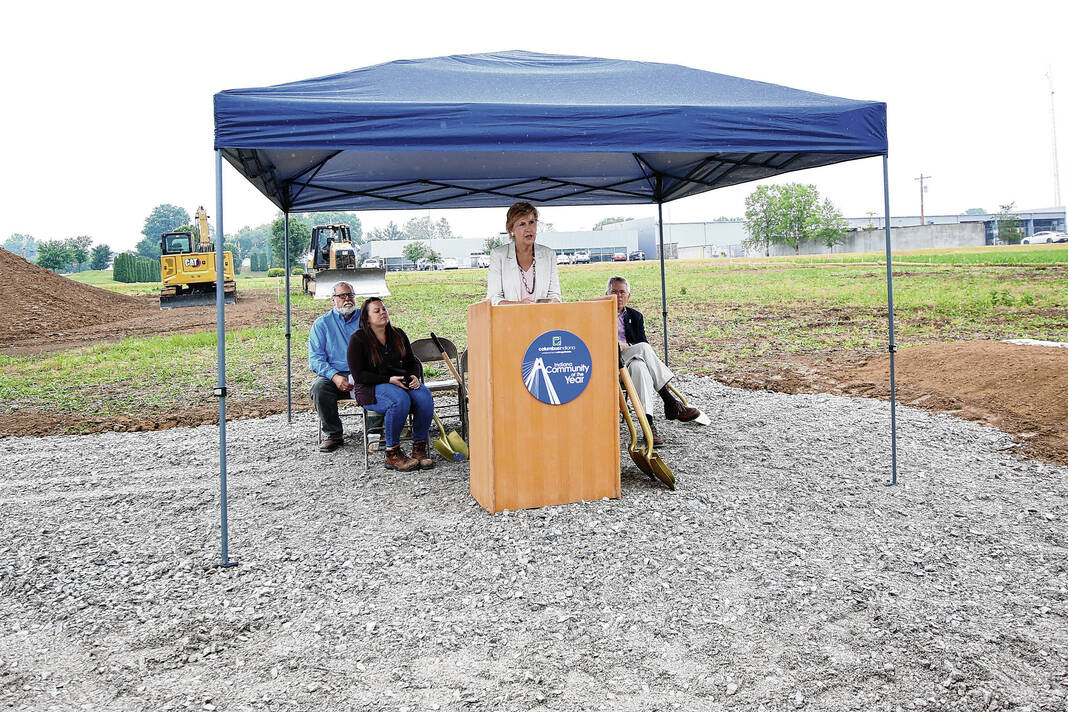 Carla Clark | For The Republic Mary Ferdon, executive director of administration and community development for the city of Columbus, speaks during the Columbus City Utilites groundbreaking ceremony for the new water tank at the former Walesboro airport in Columbus, Ind., Wednesday, June 7, 2023.