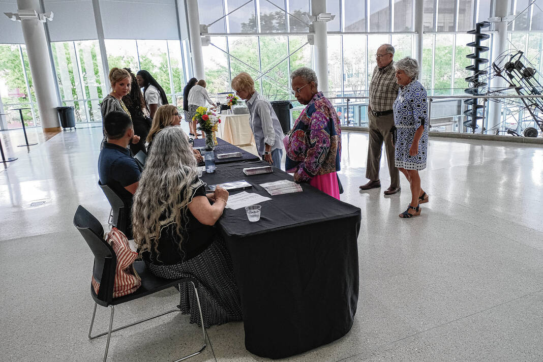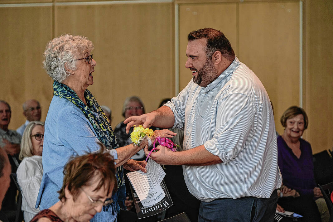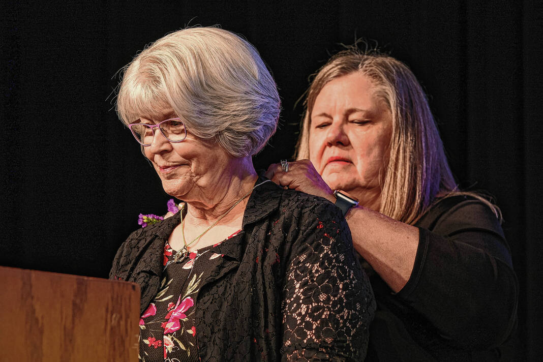 Mike Wolanin | The Republic Lisa Shafran, last year’s The Republic Woman of the Year, puts a medallion on this year’s The Republic Woman of the Year Janice Montgomery during a ceremony at The Commons in downtown Columbus, Ind., Wednesday, June 7, 2023.