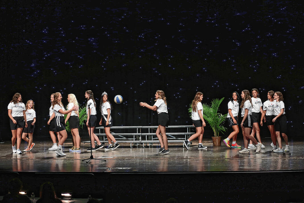 When the curtain first rose, all 13 contestants were in basketball uniforms spouting the words “All Star”. With Schwartzkopf acting as coach, most of the young ladies demonstrated some athletic prowess, and appeared more than capable of passing the ball quickly in a conventional training exercise. In one demonstration, they passed the ball over their heads down a line to one another.