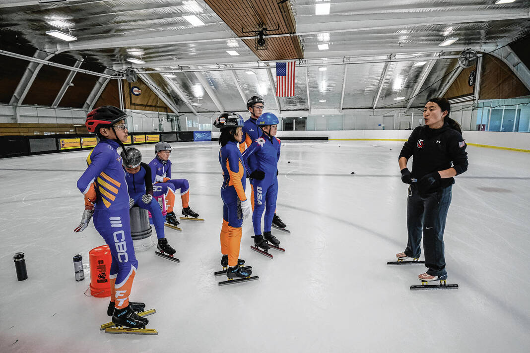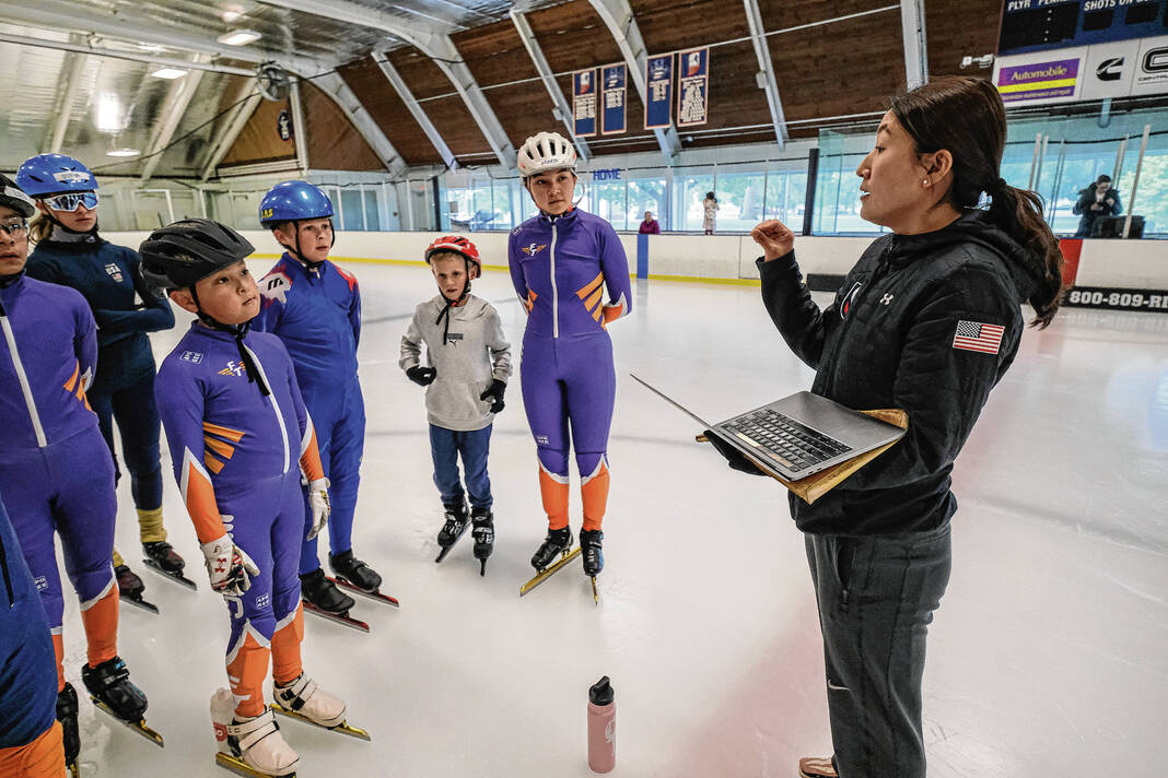 Olympian Lin Lin Sun gives instructions to a group of speed skaters during a clinic at Hamilton Community Center and Ice Arena in Columbus, Ind., Wednesday, June 22, 2023. The Full Throttle Speed Skating Team hosted a training clinic by Sun, who won a gold medal for China in the 2010 Olympics in Vancouver.