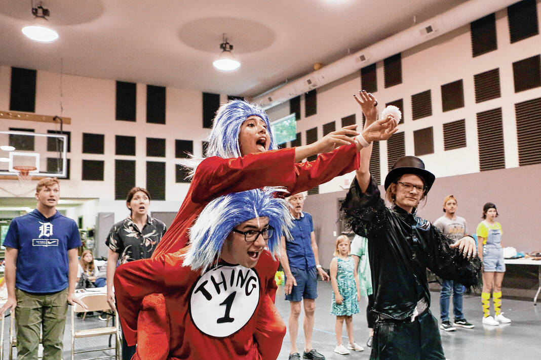 Maria Sanchez Cisneros, as Thing 2, held up by Ethan Burton as Thing 1, reaches for Horton’s pink clover flower from Elliott Sutherland, as Vlad Vladikoff, during a rehearsal of the Mill Race Theatre Company’s production of “Seussical”.
