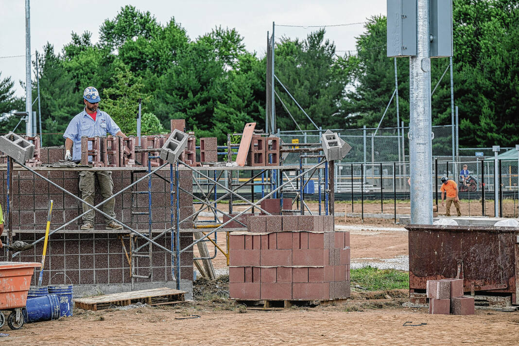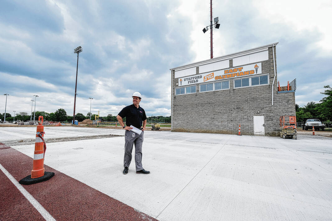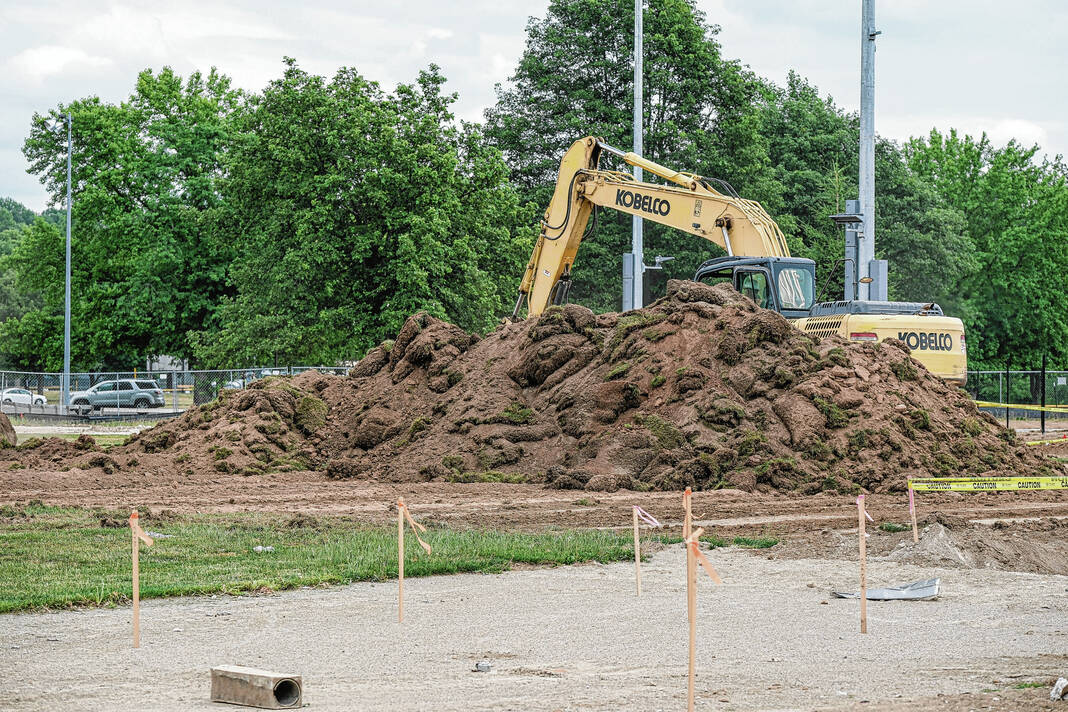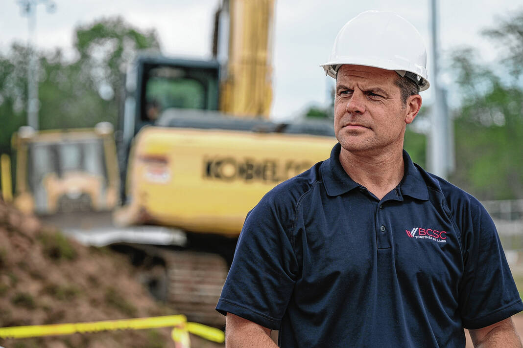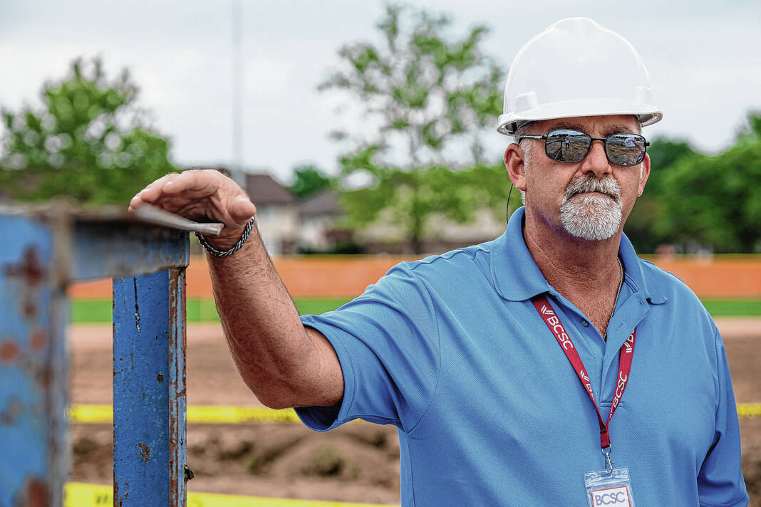 Brett Boezeman, director of operations for Bartholomew Consolidated School Corp., looks on as contractors work on improving and renovating the athletics areas for baseball, softball and football at Columbus East High School in Columbus, Ind., Friday, June 23, 2023.