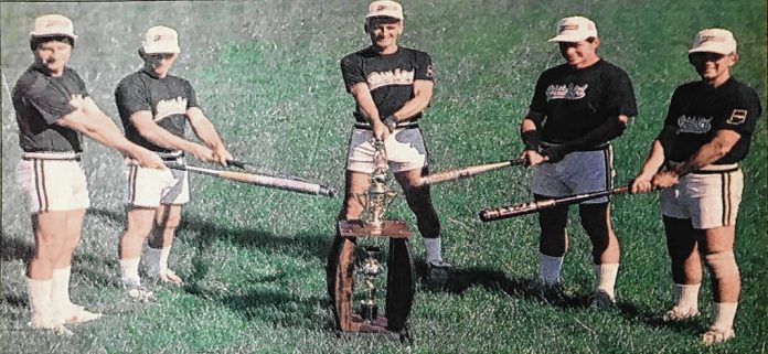 Columbus Indiana Slo-Pitch Softball Hall of Famers, from left, Dave Pope, Dewey Whitis, Lou Giovanini and Ron Cochran pose for a photo with Ted Winterrowd, right, after their Capitol team won the 45-and-over national tournament in Gadsden, Alabama.