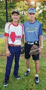 Columbus Indiana Slo-Pitch Softball Hall of Famers Russell Whilhot, left, and Dewey Whitis pose for a photo.