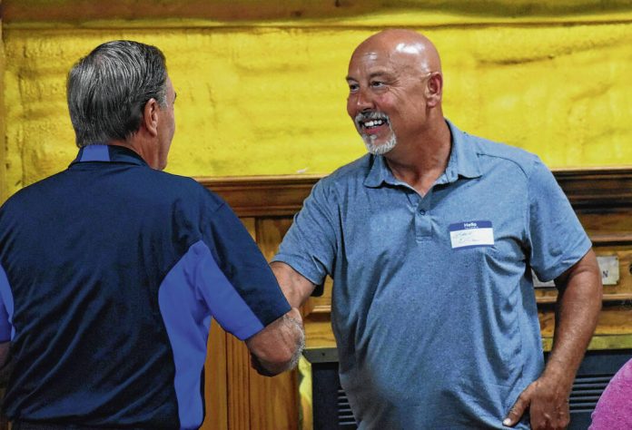 Hayden High School Alumni Association President Pat Sullivan, left, welcomes inductee Bart Ellison into the Hayden Hall of Fame for 2023 during the Hayden homecoming June 25 at the Hayden Historical Museum pavilion.