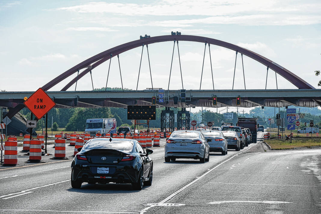 A view of the traffic pattern on State Road 46 amid repair work on the Interstate 65 bridge in Columbus on Tuesday.
