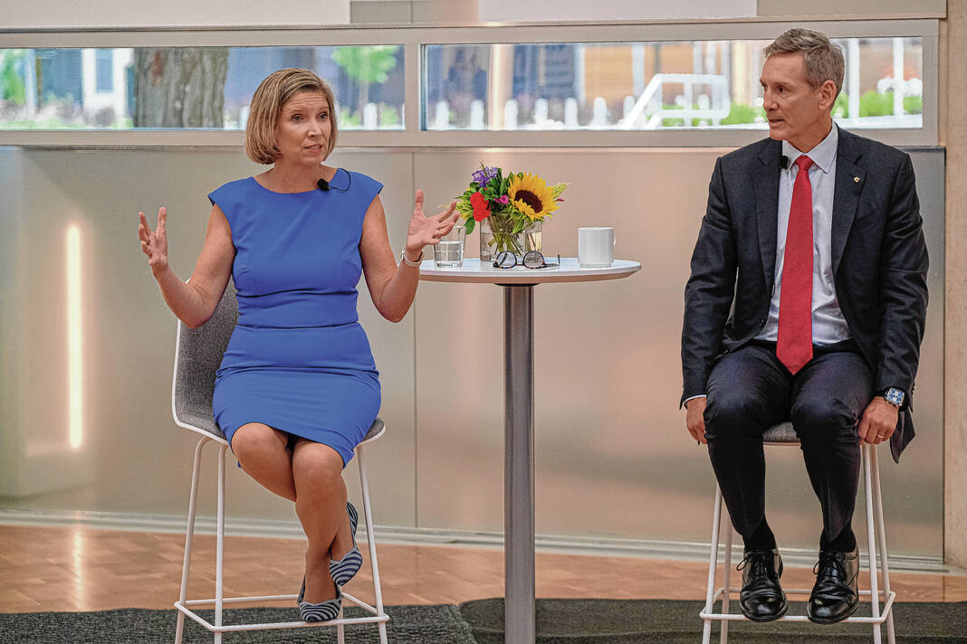 Mike Wolanin | The Republic Incoming Cummins President and CEO Jennifer Rumsey, left, and Cummins Chairman and CEO Tom Linebarger answer questions during a press conference at the Cummins Corporate Office Building in Columbus, Ind., Thursday, July 14, 2022. Rumsey is the first woman CEO since the company was founded more than 100 years ago.