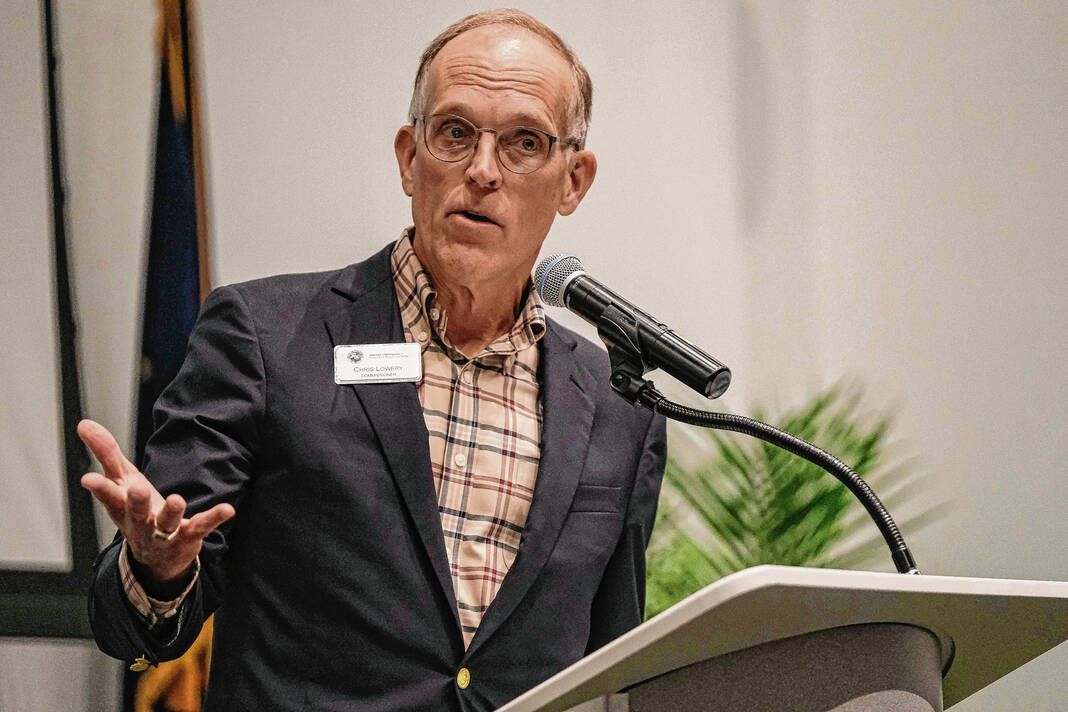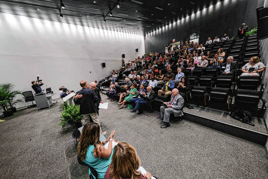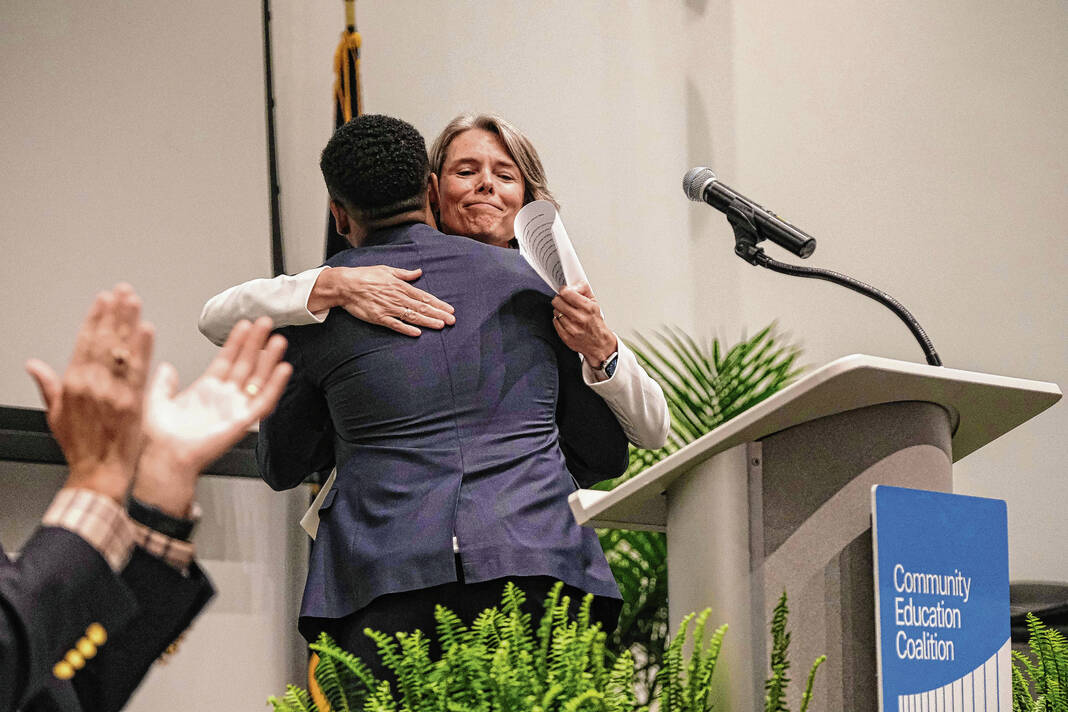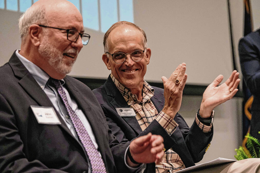 Mike Wolanin | The Republic Indiana Commission for Higher Education Commissioner Chris Lowery joins guests in a round of applause for John Burnett, executive vice chair for the Community Education Coalition, during the 25th anniversary celebration for the Community Education Coalition at the Columbus Learning Center in Columbus, Ind., Wednesday, July 12, 2023.