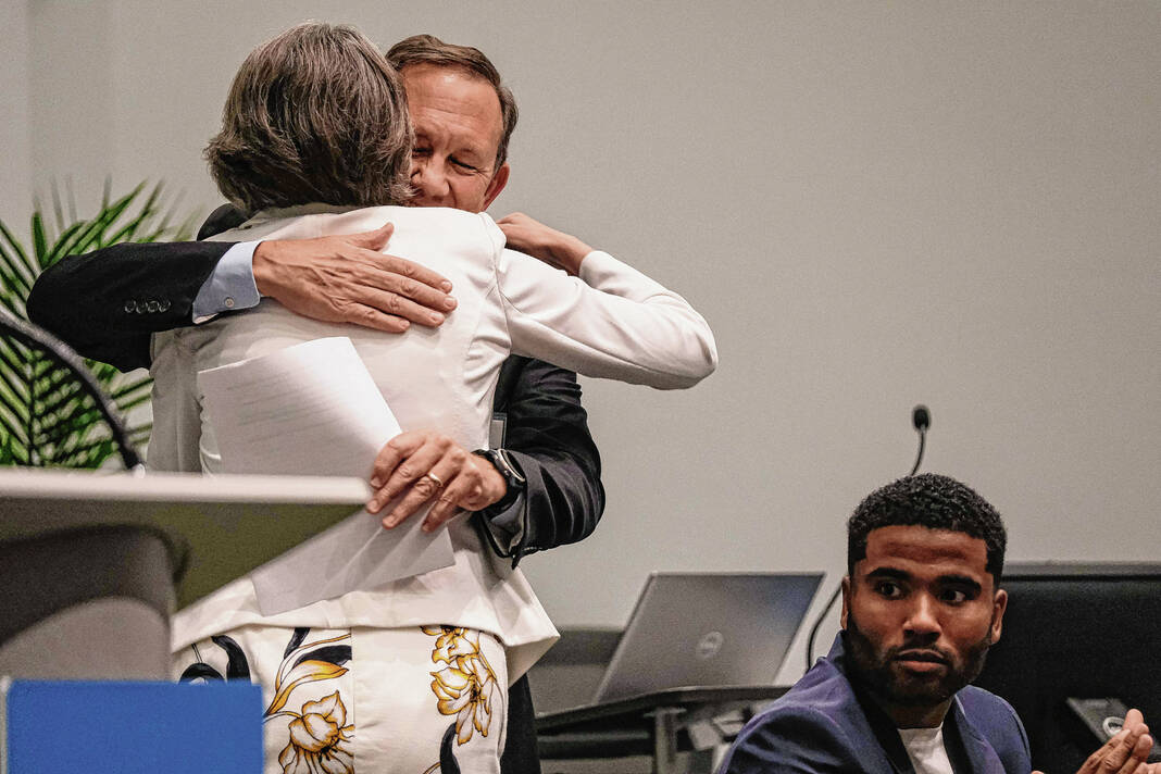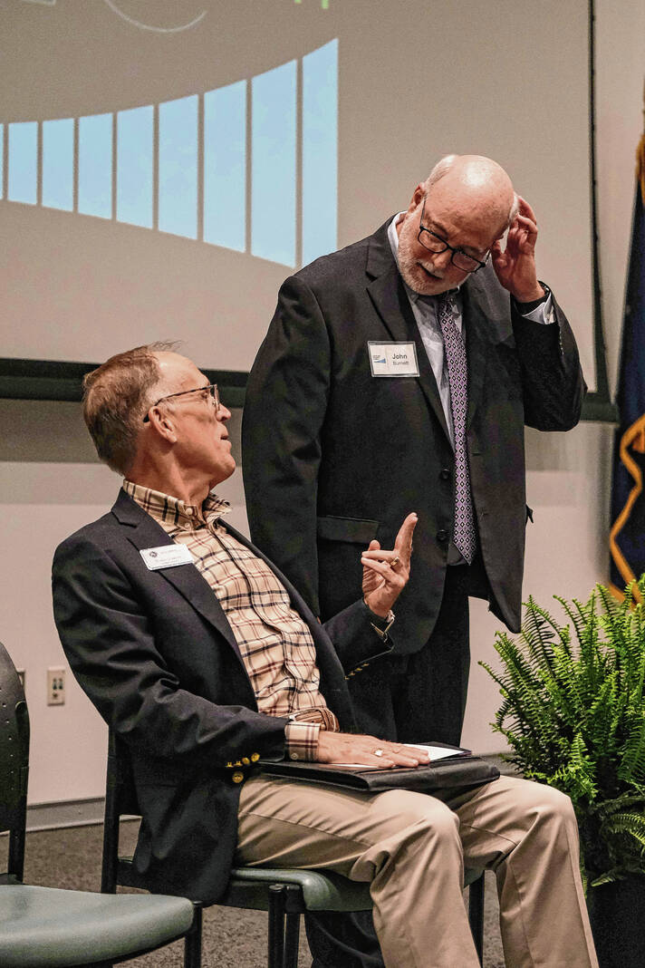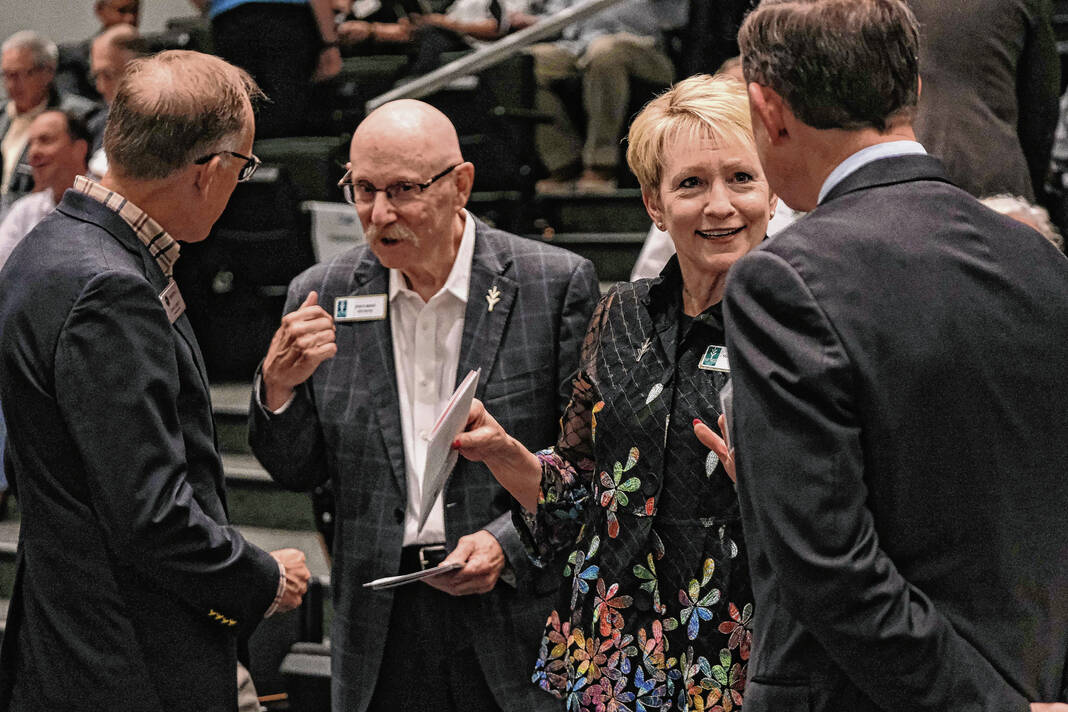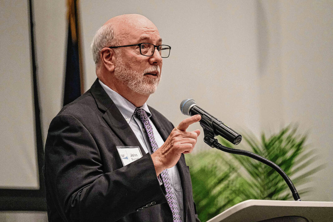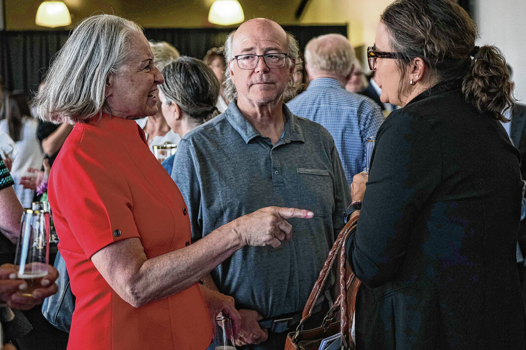 Mike Wolanin | The Republic Indiana Commission for Higher Education Commissioner Chris Lowery joins guests in a round of applause for John Burnett, executive vice chair for the Community Education Coalition, during the 25th anniversary celebration for the Community Education Coalition at the Columbus Learning Center in Columbus, Ind., Wednesday, July 12, 2023.
