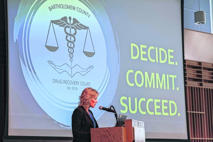 More than 100 people were in the audience at The Commons as the 10 graduates were praised for their successful completion of the program. As Bartholomew Circuit Court Judge Kelly Benjamin put it, “that took guts.”