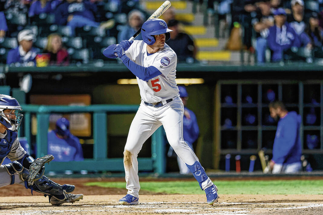 Columbus North graduate Devin Mann bats for the Oklahoma City Dodgers on opening night this spring.
