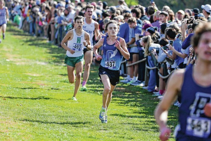 Columbus North’s Neal White approaches the finish line in the Brown County Semistate at Eagle Park in Nashville, Saturday, Oct. 22, 2022.