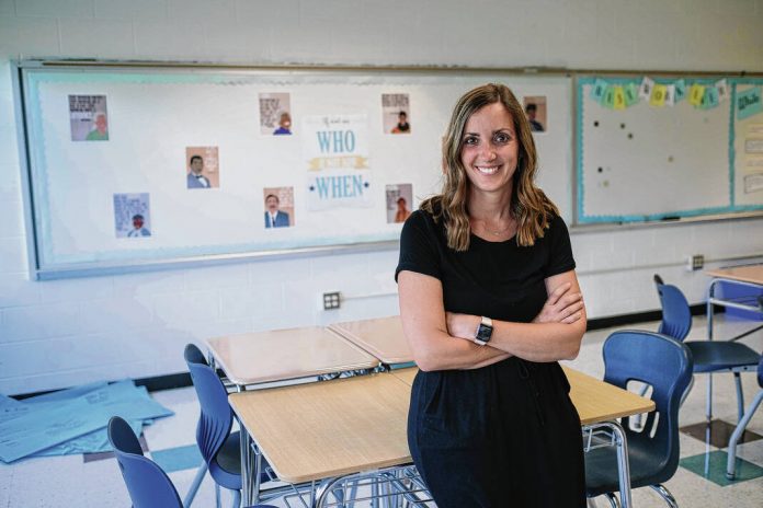 Mike Wolanin | The Republic Northside Middle School social studies teacher Molly Fountain poses for a photo in her classroom at Northside Middle School in Columbus, Ind., Tuesday, Aug. 8, 2023. Fountain was named the Bartholomew Consolidated School Corp. Teacher of the Year.