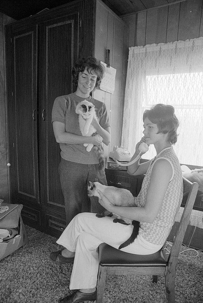 Holding two “residents” of the Bartholomew County Humane Society’s shelter, Cheryl Zuckschwerdt, left, corresponding secretary of the group, and Mary Jo Morris manned the “hot line,” created to answer animal-related calls and concerns from area residents in 1973.