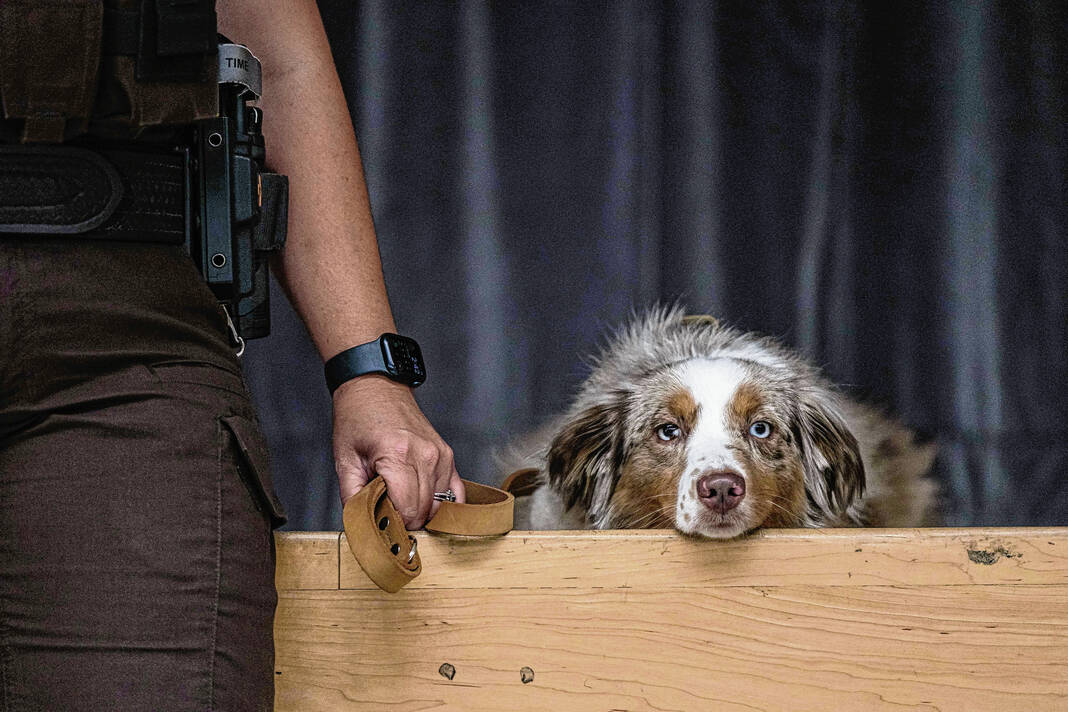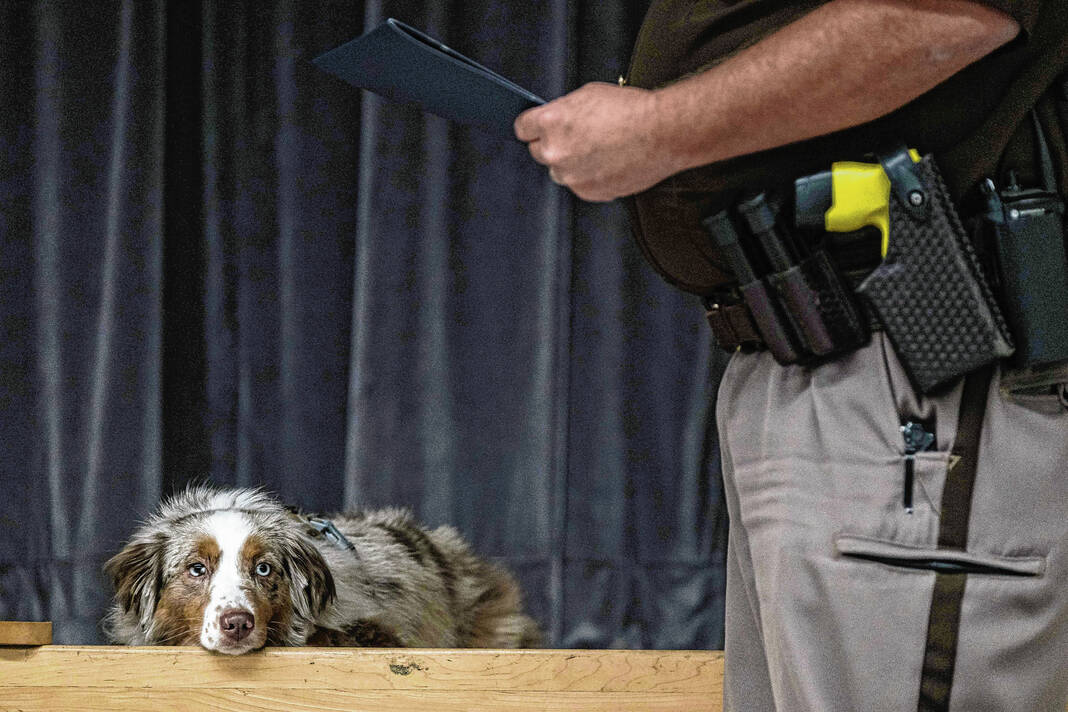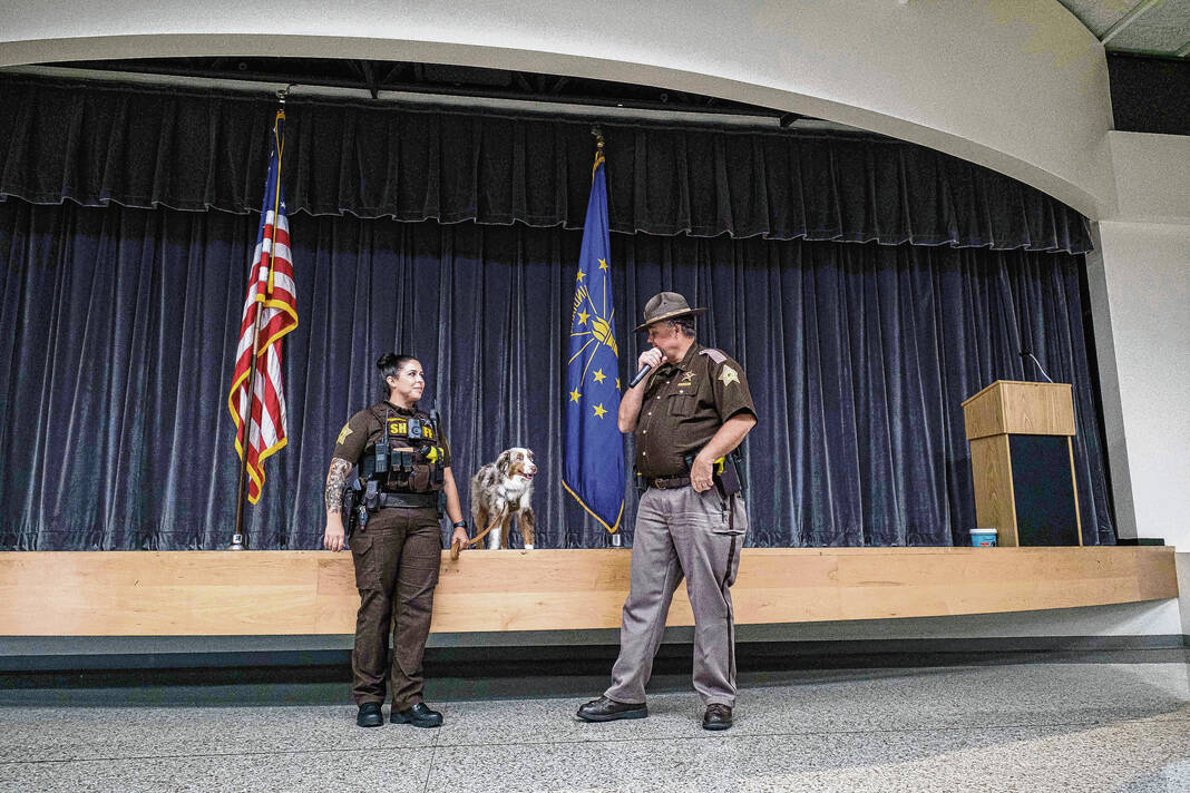 Mike Wolanin | The Republic Bartholomew County Sheriff’s Deputy Jessica Pendleton holds the leash of her dog Starlight as Starlight is sworn in as the new Flat Rock-Hawcreek School Corp. therapy dog by Bartholomew County Sheriff Chris Lane at Hauser Jr.-Sr. High School in Hope, Ind., Tuesday, Aug. 15, 2023.