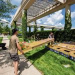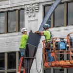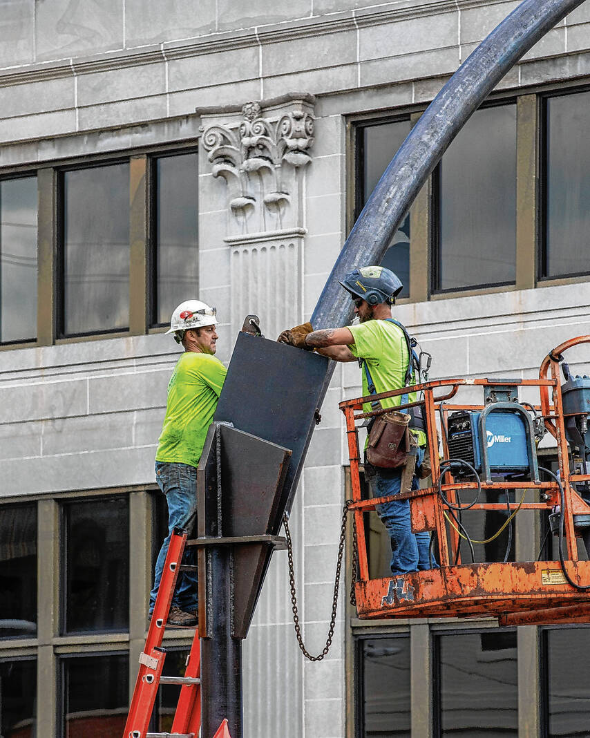 Late Tuesday, after the installation’s structural beams were put in place by a crane parked in the street, he spoke with cautious optimism about what soon will be his firm’s first official, major completed project — a source of pride and joy to the extent that he said both he and his wife, Maria Alataris, will literally be dancing in the street with attendees at the 7 p.m. Aug. 26 free outdoor party called “Rock the Block” with live music.