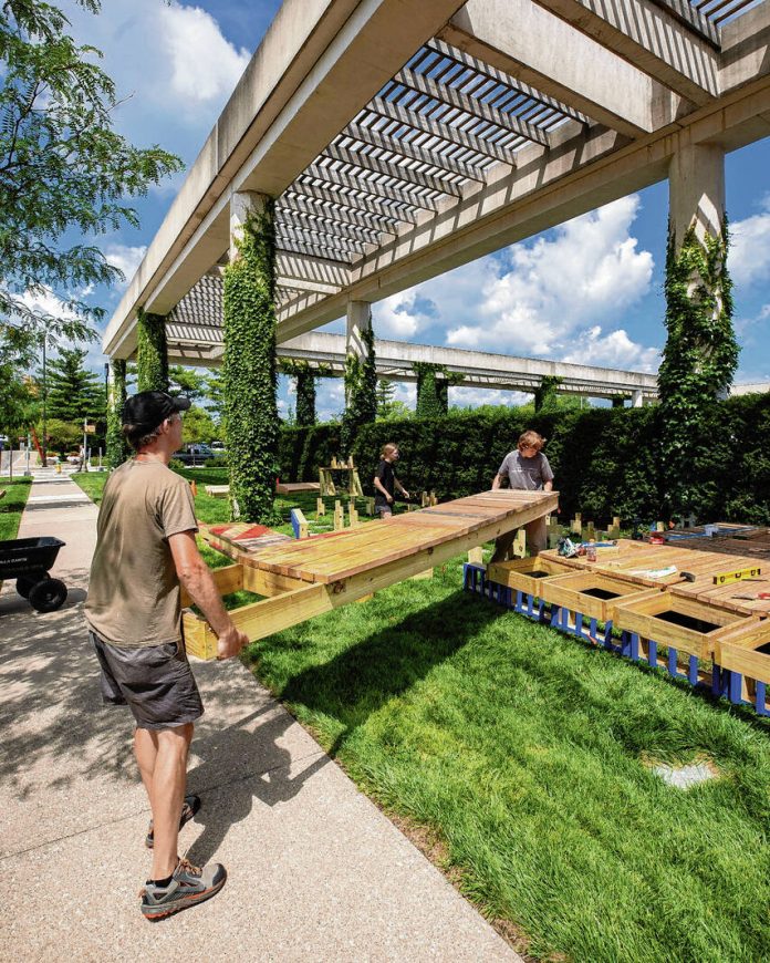 Photo by Hadley Fruits | Exhibit Columbus Workers begin installation of “Ground Rules” by Jessica Colangelo and Charles Sharpless, representing the University of Arkansas Fay Jones School of Architecture and Design Fayetteville at the Cummins Inc. headquarters in downtown Columbus.