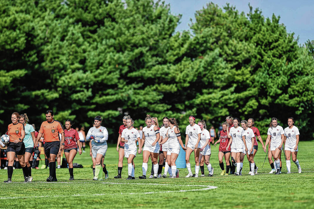 Members of the Indiana University-Columbus women’s soccer team take the field for the first game of their inaugural season at the Richard Wigh Soccer Complex in Columbus, Ind., Friday, Aug. 18, 2023.