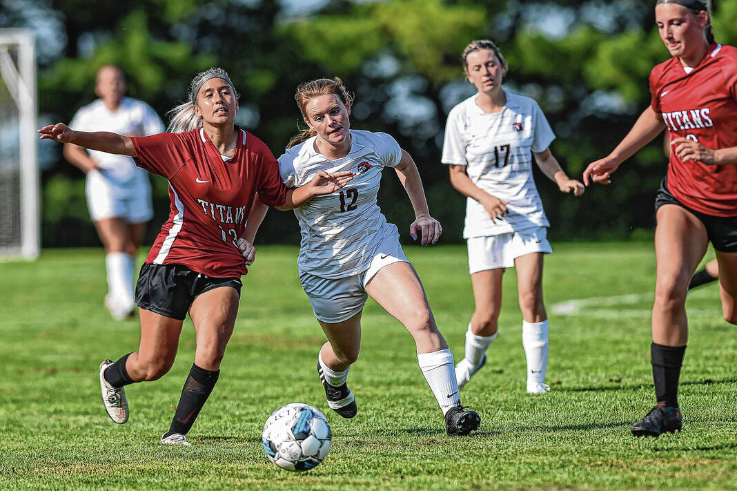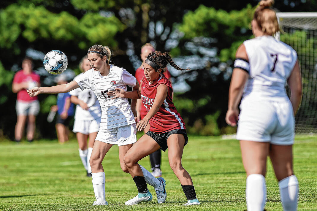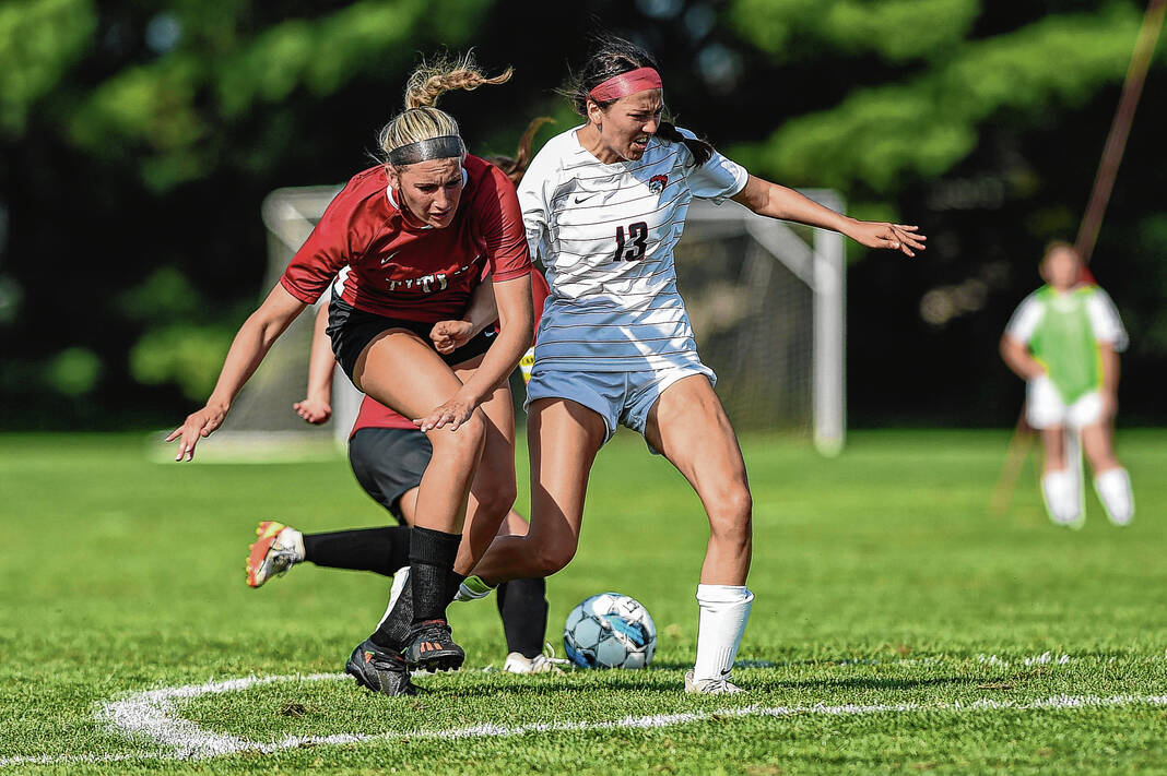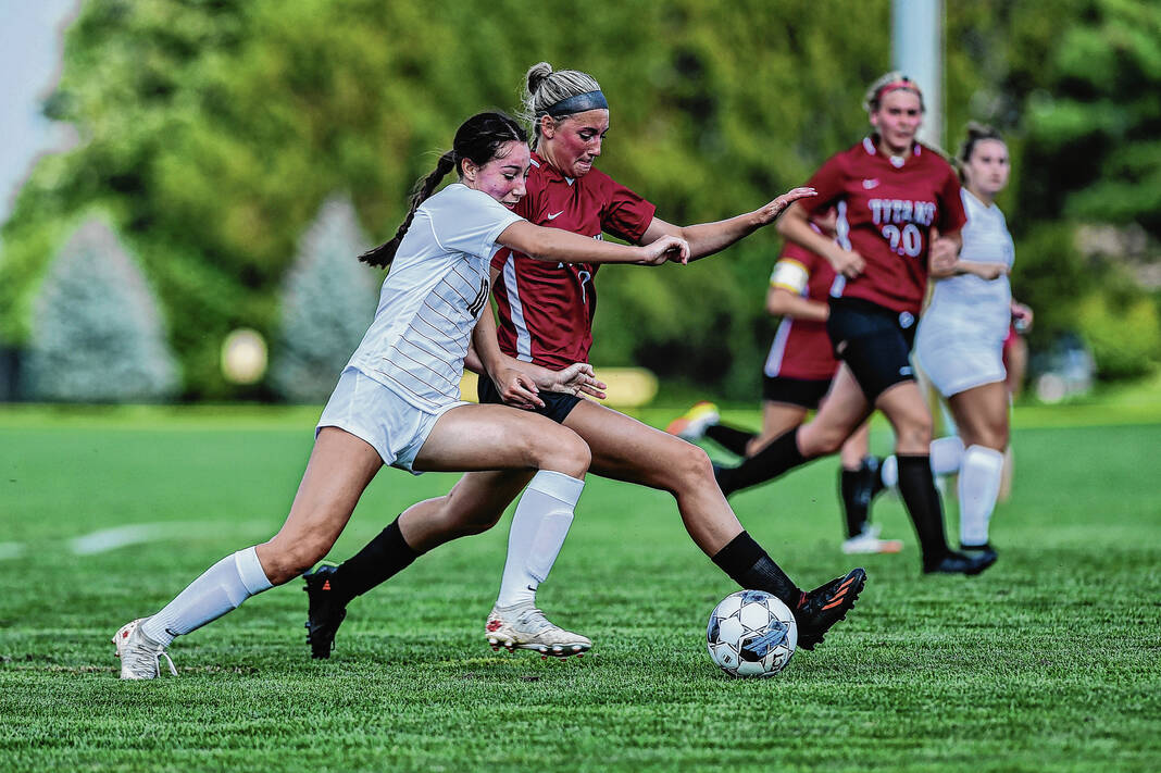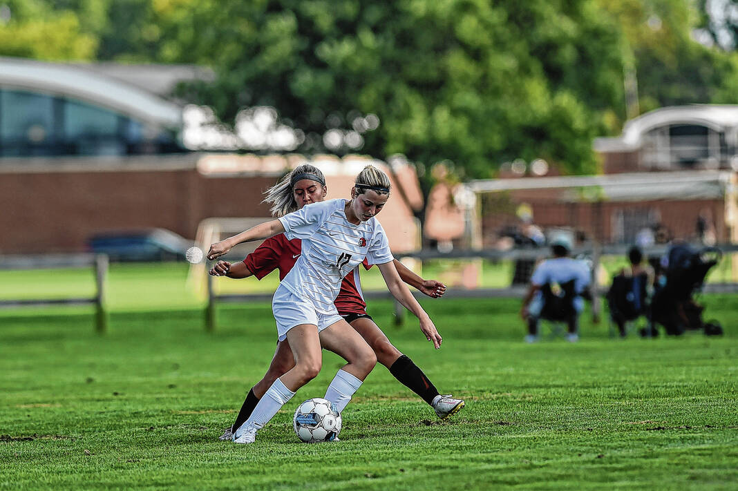 IU-Columbus’ Lily Campbell, left, attempts to shield the ball from IU-South Bend’s Caylee Hoy during the first game of the IU-Columbus women’s soccer team’s inaugural season at the Richard Wigh Soccer Complex in Columbus, Ind., Friday, Aug. 18, 2023.