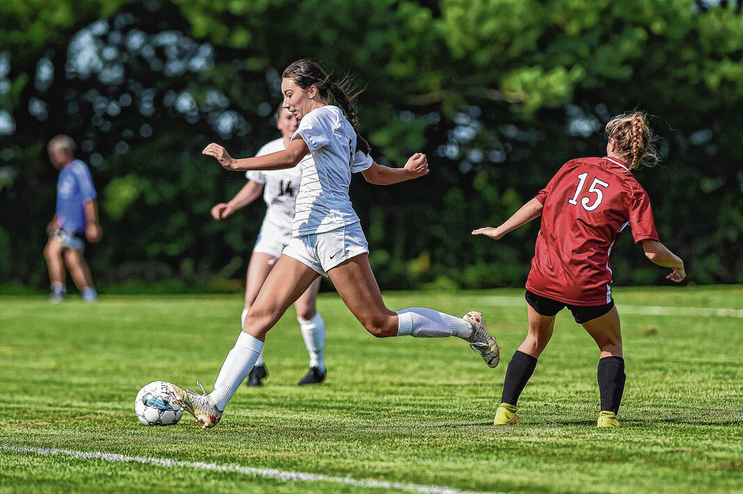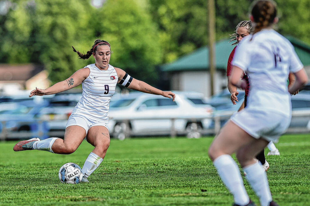IU-Columbus’ Sophie Parker plays the ball forward during a soccer match against IU-South Bend at the Richard Wigh Soccer Complex in Columbus, Ind., Friday, Aug. 18, 2023. The game marked the beginning of the IU-Columbus women’s soccer program’s inaugural season.