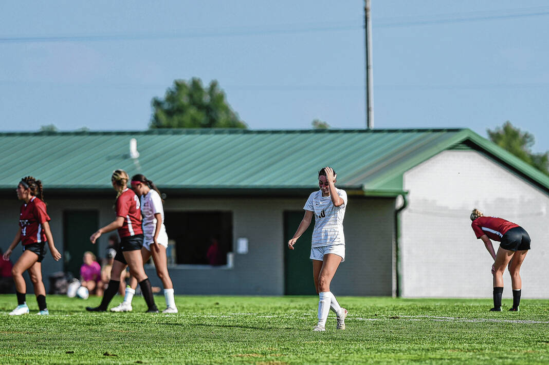 IU-Columbus’ Lily Campbell reacts after missing a shot during a soccer match against IU-South Bend at the Richard Wigh Soccer Complex in Columbus, Ind., Friday, Aug. 18, 2023. The game marked the beginning of the IU-Columbus women’s soccer program’s inaugural season.