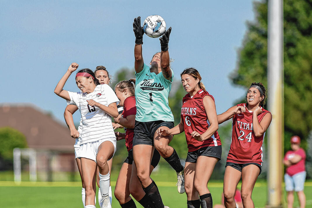 IU-Columbus goalkeeper Ana Jackson, left, collects the ball ahead of IU-South Bend’s Haylie Rodriguez during the first game of the IU-Columbus women’s soccer team’s inaugural season at the Richard Wigh Soccer Complex in Columbus, Ind., Friday, Aug. 18, 2023.
