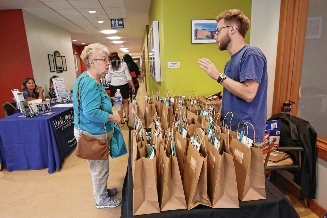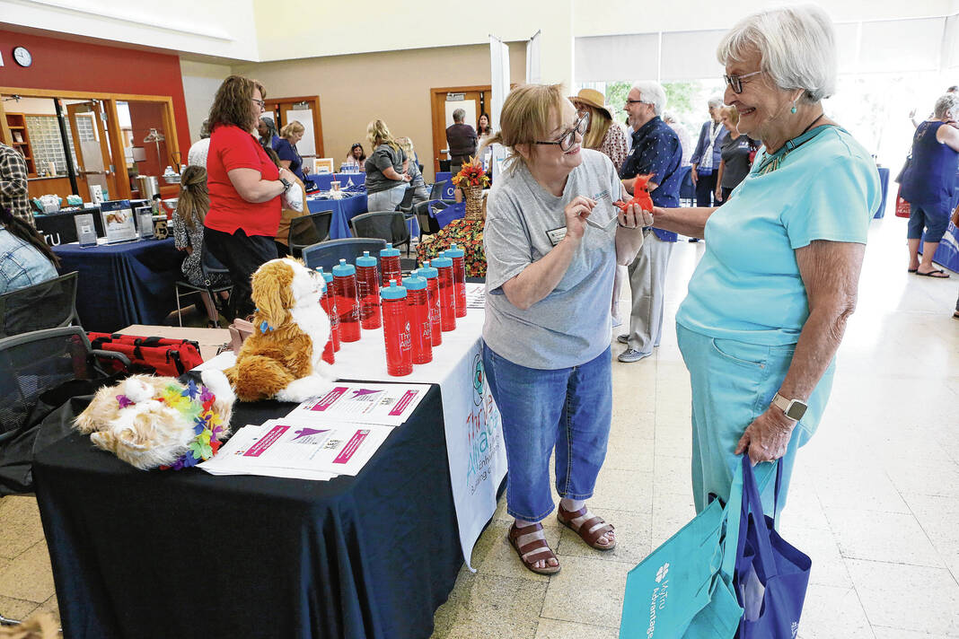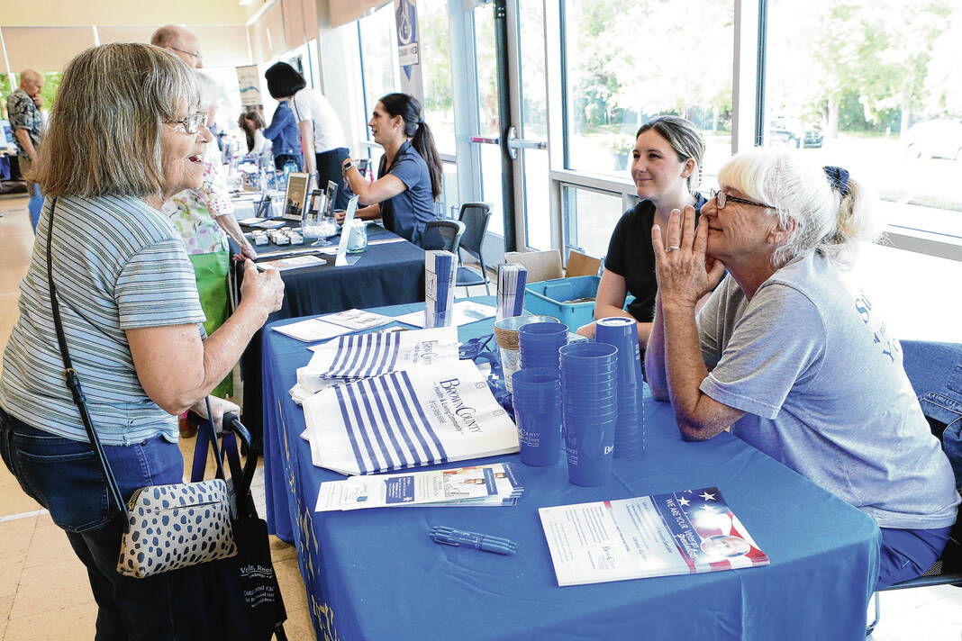 Carla Clark | For The Republic Betty Shinolt, at left, asks Conner Swank, Alliance for Substance Abuse Progress, about their services and what is available during the Senior Expo at Mill Race Center, Columbus, Ind., Friday, August 18, 2023.