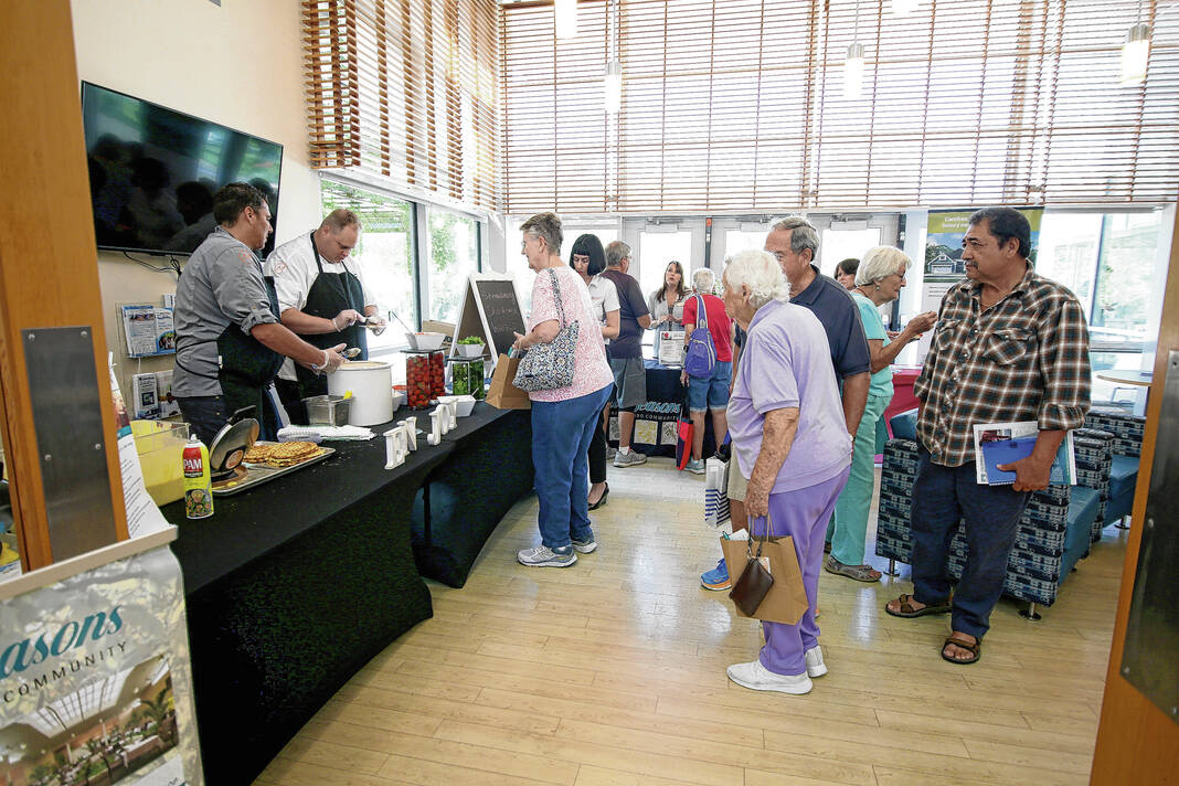 Carla Clark | For The Republic At the Four Seasons Retirement Community booths, Sean Rivas and David Siegler, at left, prepare strawberry shortcake on waffles, as people receive information and literature about Four Seasons Retirement Community at other tables, during the Senior Expo at Mill Race Center, Columbus, Ind., Friday, August 18, 2023.