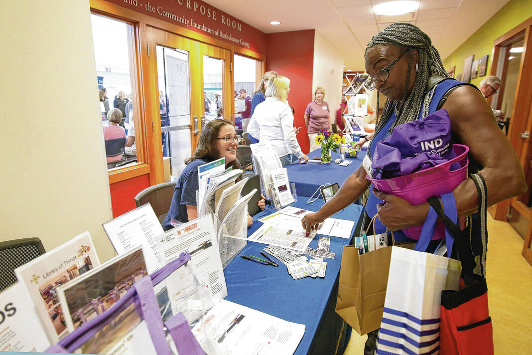 Carla Clark | For The Republic Valerie Baute, outreach manager Bartholomew County Public Library, at left and Stella Collins at the BCPL booth during the Senior Expo at Mill Race Center, Columbus, Ind., Friday, August 18, 2023.