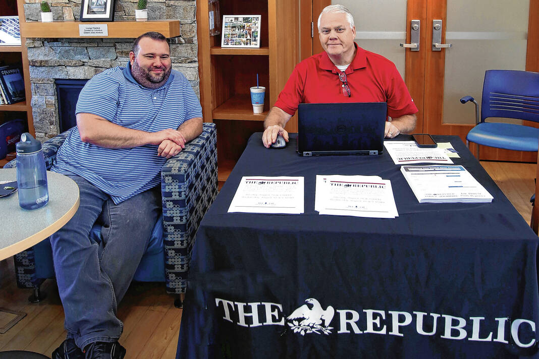 Carla Clark | For The Republic David Hyde, Jr., AIM Media Indiana marketing and events manager, at left, and Steve Swails, AIM Media group circulation director, during the Senior Expo at Mill Race Center, Columbus, Ind., Friday, August 18, 2023.