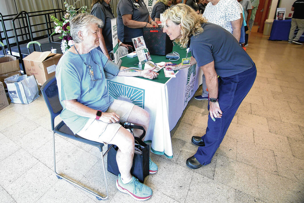Carla Clark | For The Republic Sondra Bolte, at left, gets a free blood pressure check from Kim Reed at the Columbus Regional Health booth during the Senior Expo at Mill Race Center, Columbus, Ind., Friday, August 18, 2023.