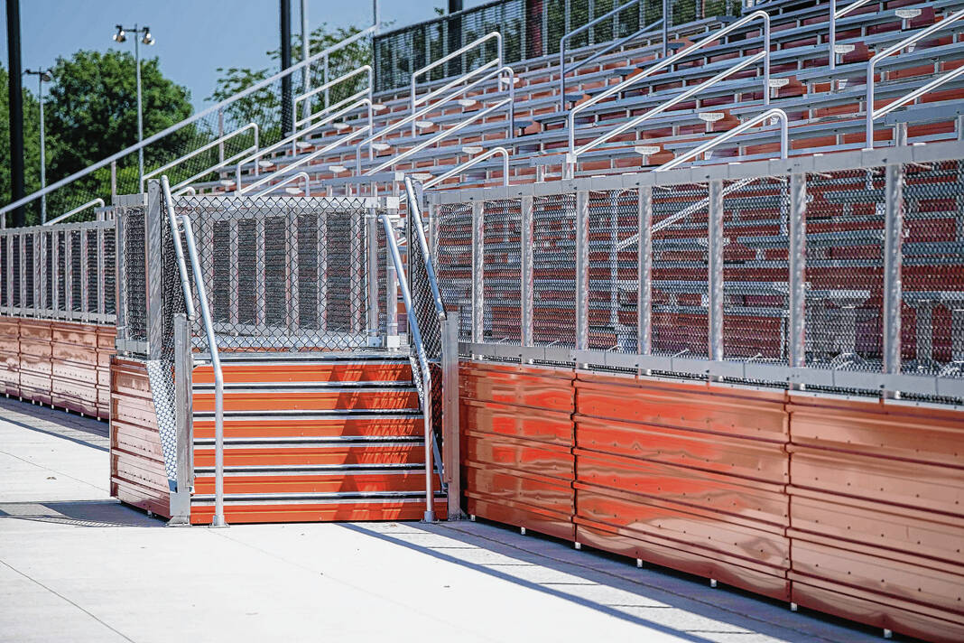 The orange color scheme for the football visiting bleachers is identical to the home side of the field. The bleachers also were pushed back a bit to create more walkway space for the fans. They were installed around the second week of July.