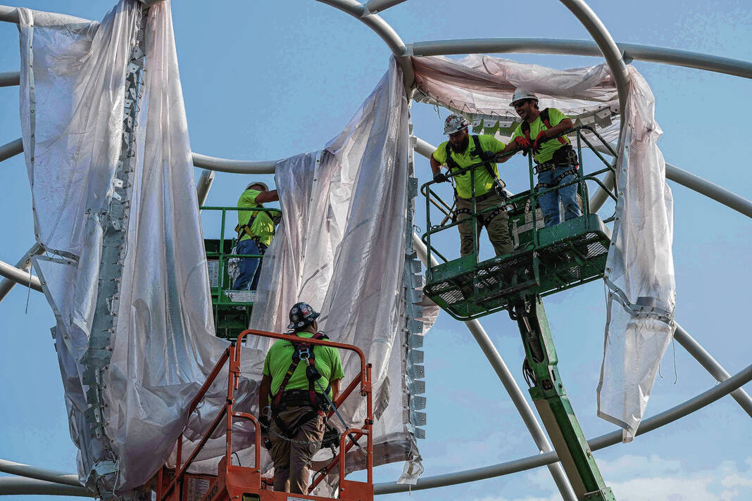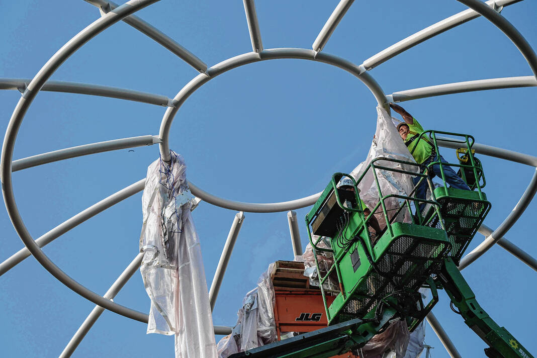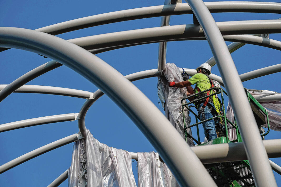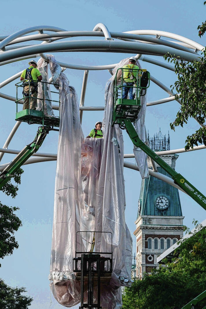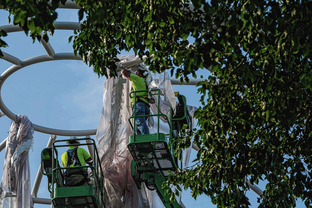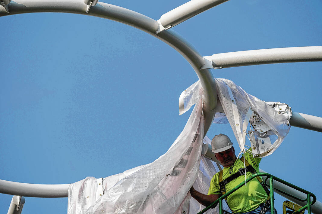 Mike Wolanin | The Republic Workers from Taylor Bros. install the white, vinyl fabric that will cover the dome of Exhibit Columbus installation InterOculus at the intersection of Fourth and Washington streets in Columbus, Ind., Tuesday, Aug. 22, 2023.