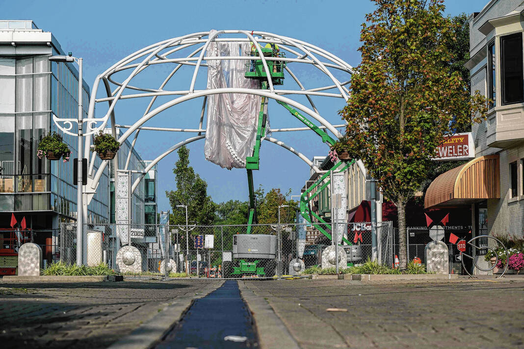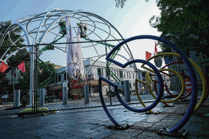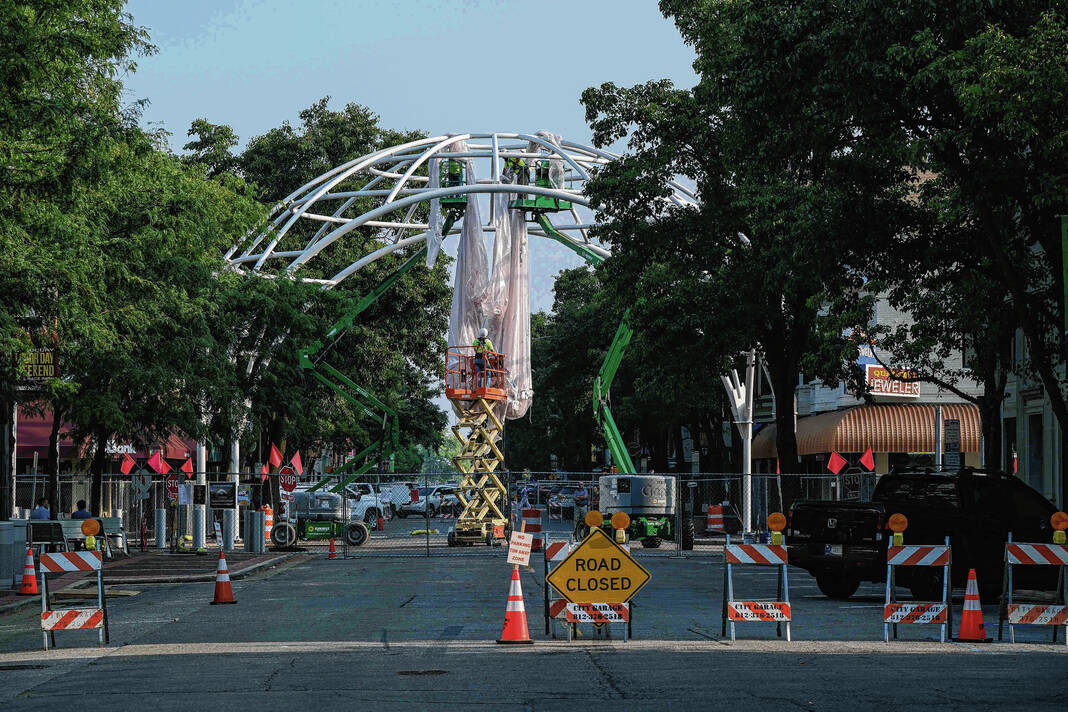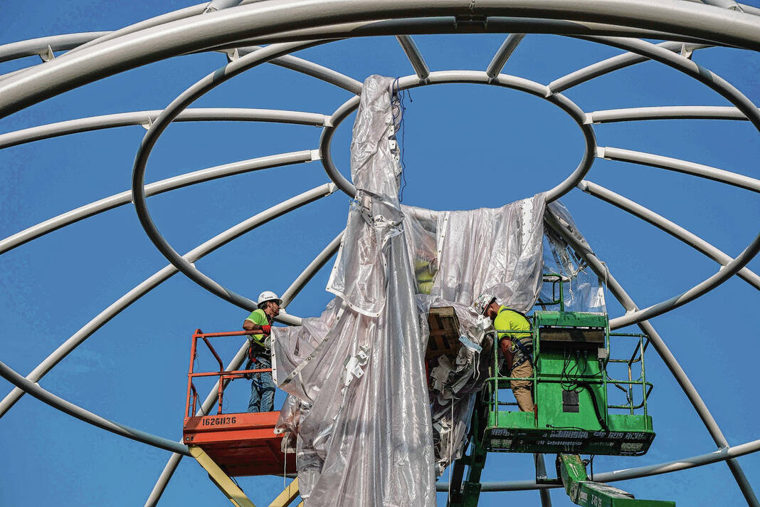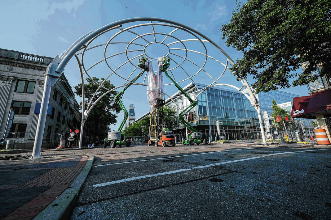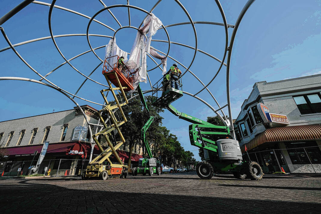 Mike Wolanin | The Republic Workers from Taylor Bros. install the white, vinyl fabric that will cover the dome of Exhibit Columbus installation InterOculus at the intersection of Fourth and Washington streets in Columbus, Ind., Tuesday, Aug. 22, 2023.