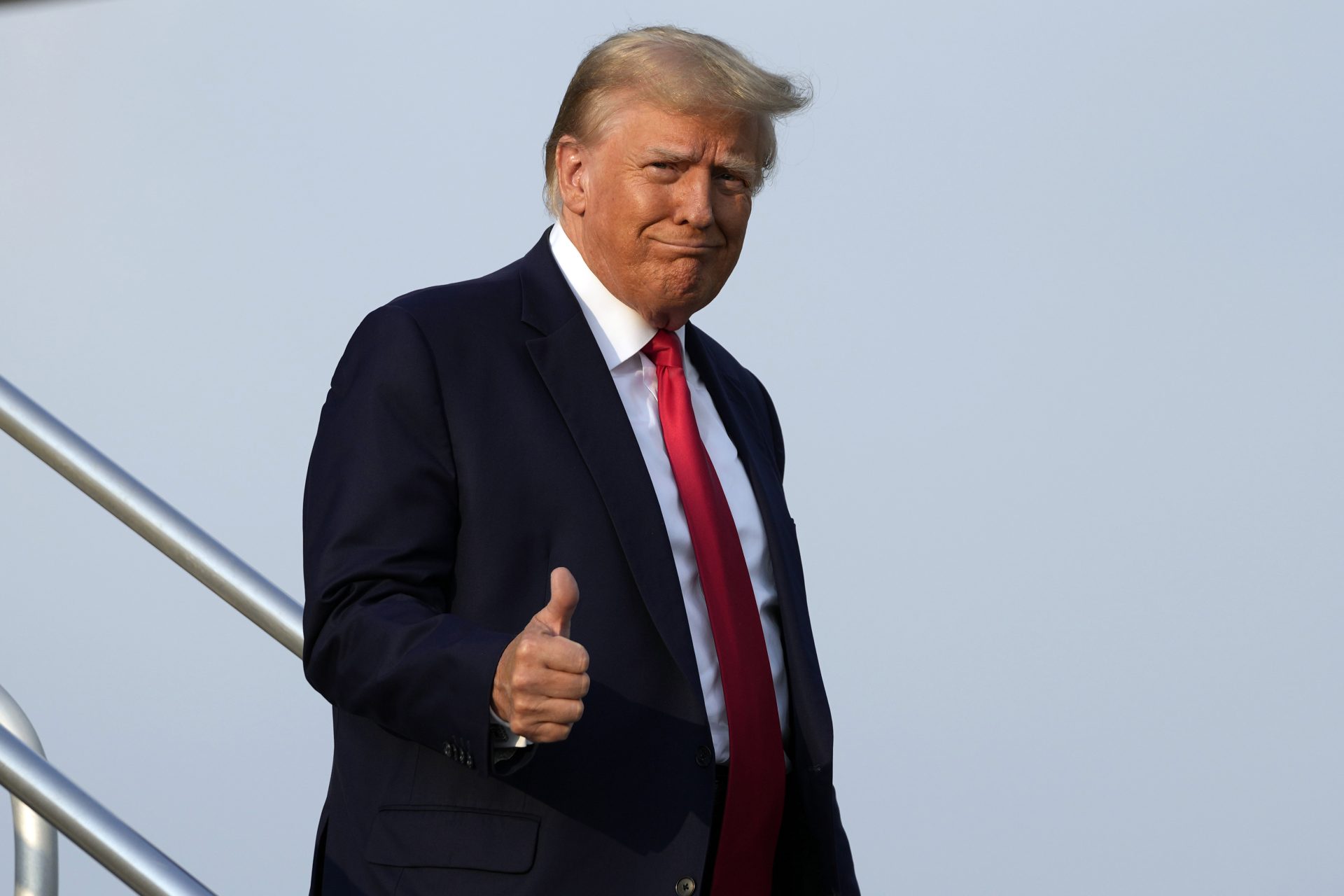Trump landed in Atlanta shortly after 7 p.m. and was driven, through the city’s rush-hour traffic, to jail for the booking process. Wearing his signature white shirt and red tie, he offered a wave and thumbs up as he descended the steps of his private plane.