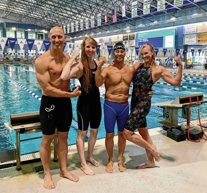 Columbus natives Bill Weaver, left, and Erika (Bass) Braun, right, were part of the Masters world record-setting 400-meter medley relay team. They were joined on the relay by Sharon Taylor and Greg Sanchez.