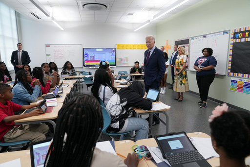 WASHINGTON (AP) — President Joe Biden and first lady Jill Biden shook hands with middle schoolers heading to lunch and dropped by an eighth grade math class Monday to welcome students back for the new school year.