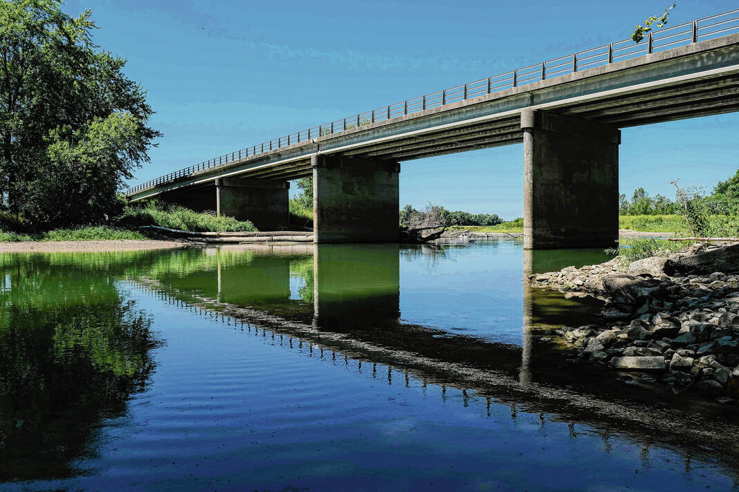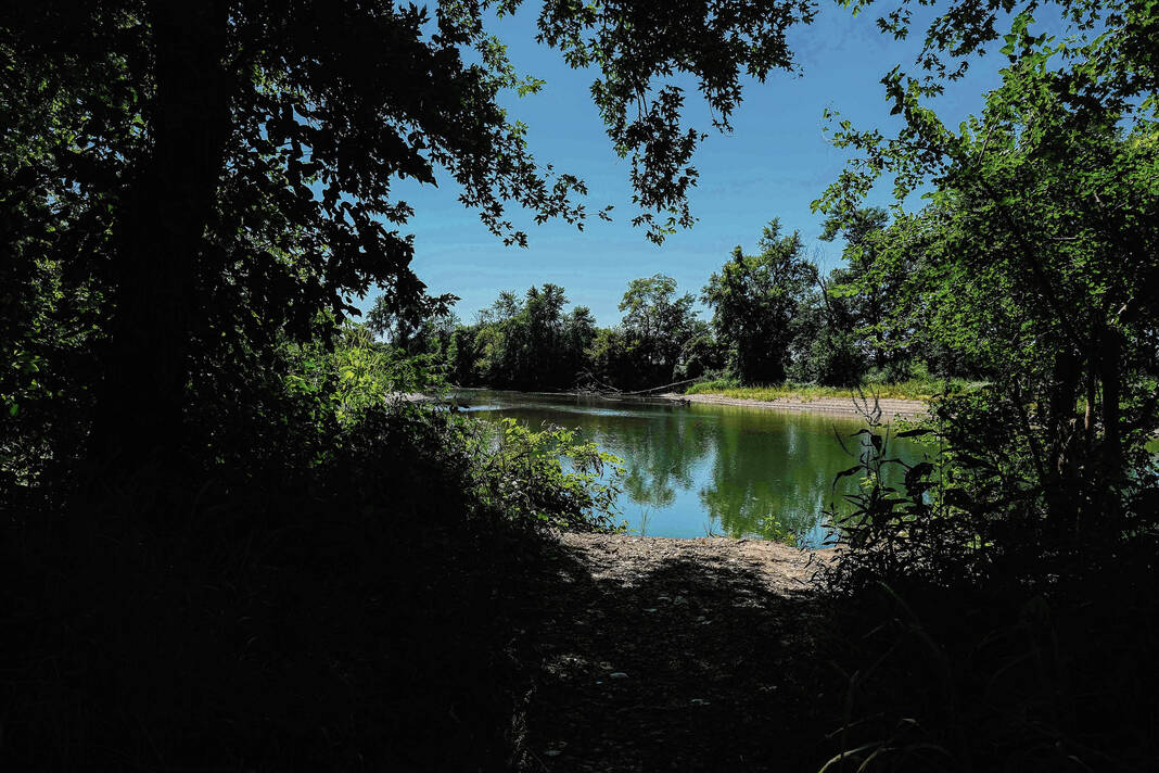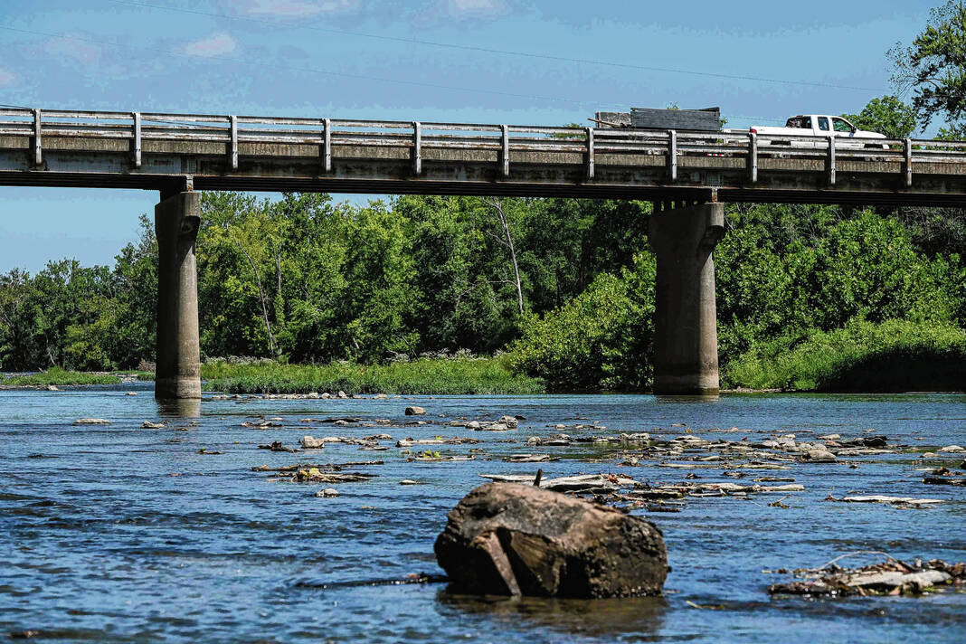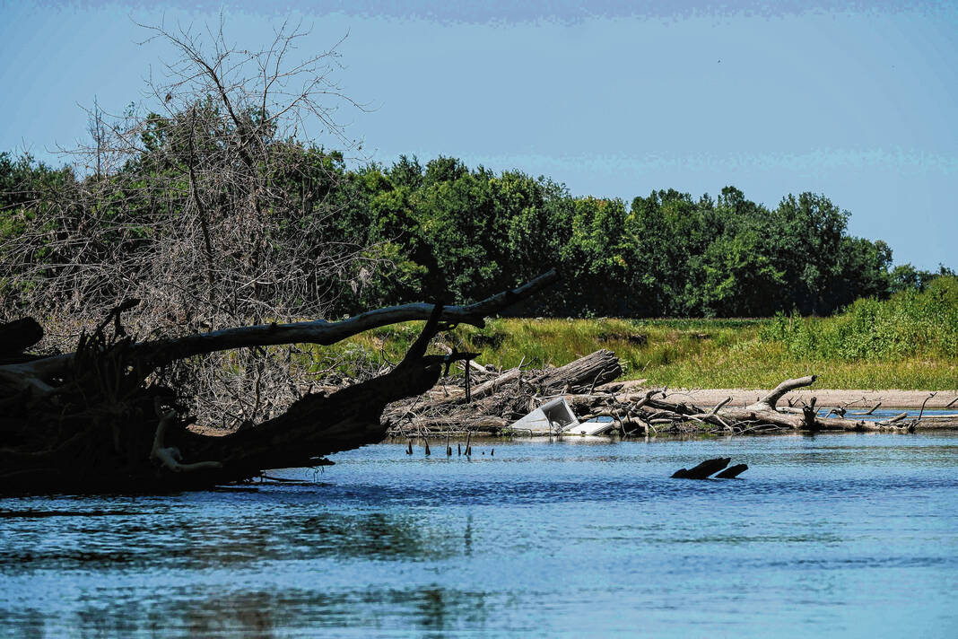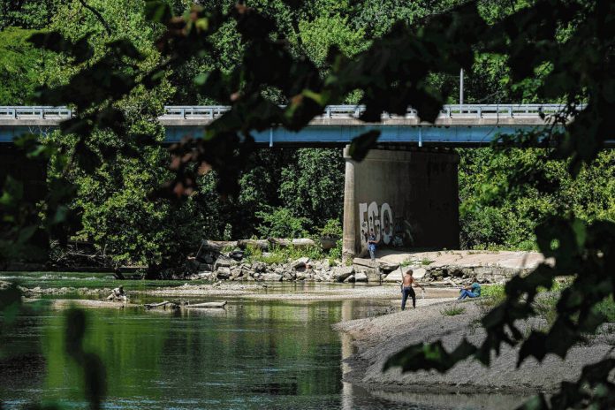 Mike Wolanin | The Republic People fish from the exposed low head dam on East Fork White River near the Third Street bridge in Columbus, Ind., Wednesday, Aug. 30, 2023. The old Columbus Municipal Landfill was located in the wooded area across the river. The landfill is an Environmental Protection Agency Superfund Site.