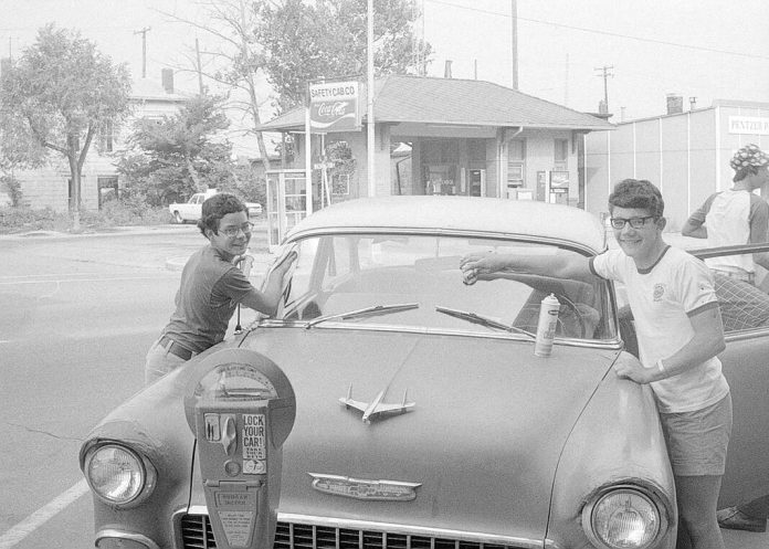 John Havens, 14, and Bryan Hawley, 13, members of the Yorkrite Chapter of the Order of Demolay, participated in a service project of cleaning car windows in the downtown area in 1973.